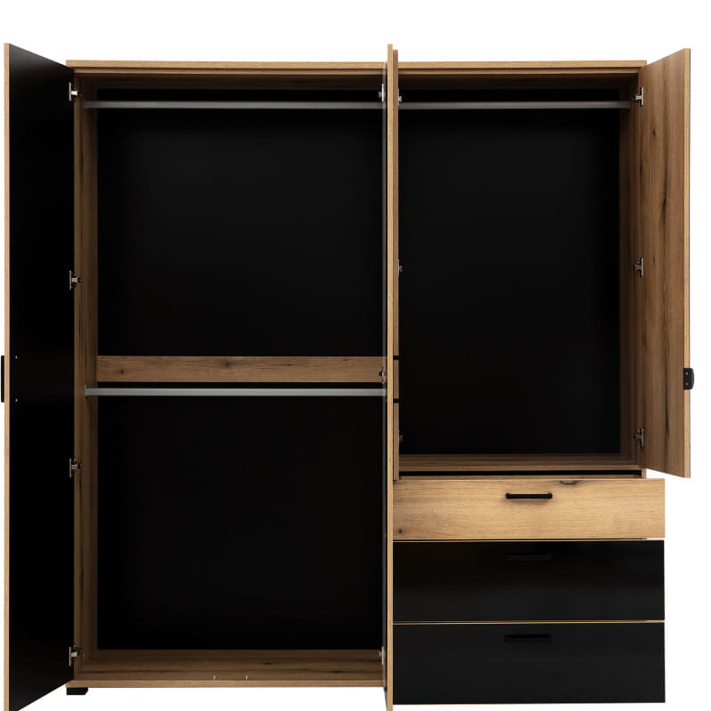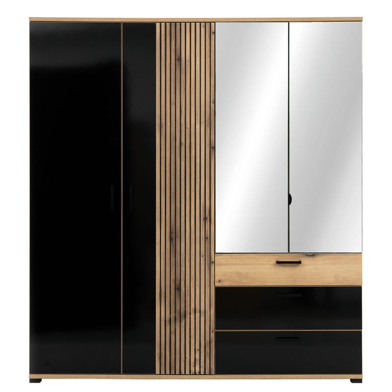 Modna i praktyczna szafa czterodrzwiowa ARIS AS11 świetnie sprawdzi się w przestrzeni sypialni czy garderoby. Dzięki trzem drążkom odwiesisz koszule, spodnie, spódnice, sukienki co pozwoli uzyskać wygodny dostęp do poszczególnych elementów twojej garderoby. Trzy pojemne szuflady zapewnią miejsce do przechowywania galanterii i bielizny. Szafę można doposażyć w dodatkowe półki ARIS AS12, które ułatwią uporządkowanie elementów garderoby. Dwa lustra na froncie posłużą nie tylko do przeglądanie się, ale również powiększą optycznie pomieszczenie. Szafa świetnie pasuje do przestrzeni utrzymanych w nowoczesnym stylu. Swoją uwagę przykuwa dzięki modnym połączeniu kolorystycznemu. Czarne fronty w połysku w zestawieniu z dekorem drewna wzbogacone efektem lameli nadają wnętrzu elegancji. Natomiast wysokie czarne nóżki w połączeniu z czarnymi uchwytami powodują że szafa jest dekoracją samą w sobie. Szafa idealnie sprawdzi się w konfiguracji z innymi bryłami z serii ARIS lub jako pojedynczy mebel, który można dopasować do własnej aranżacji pomieszczenia.