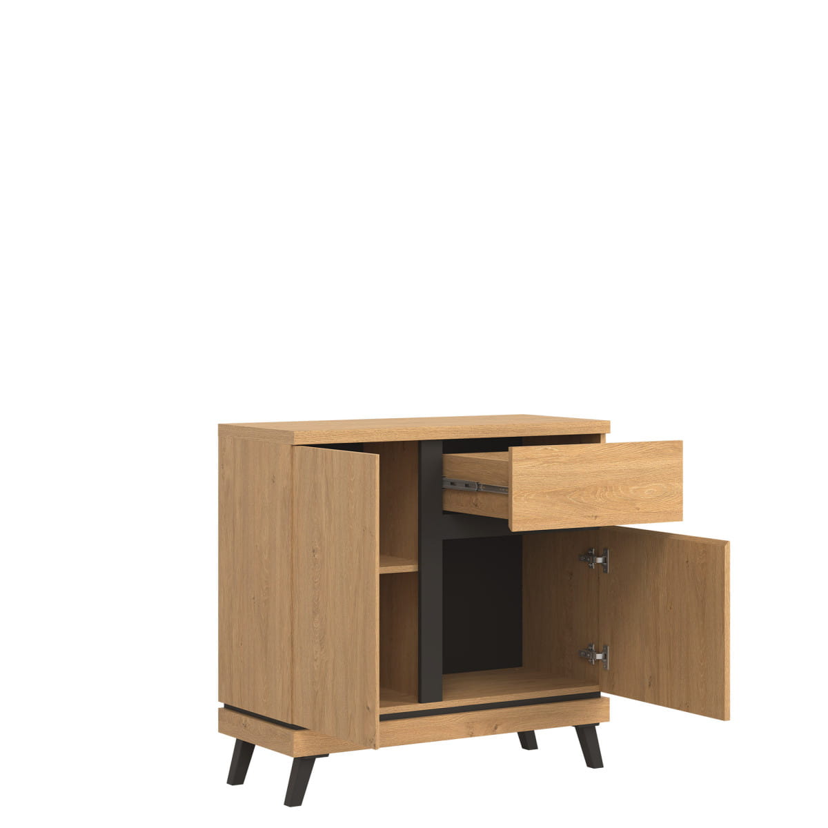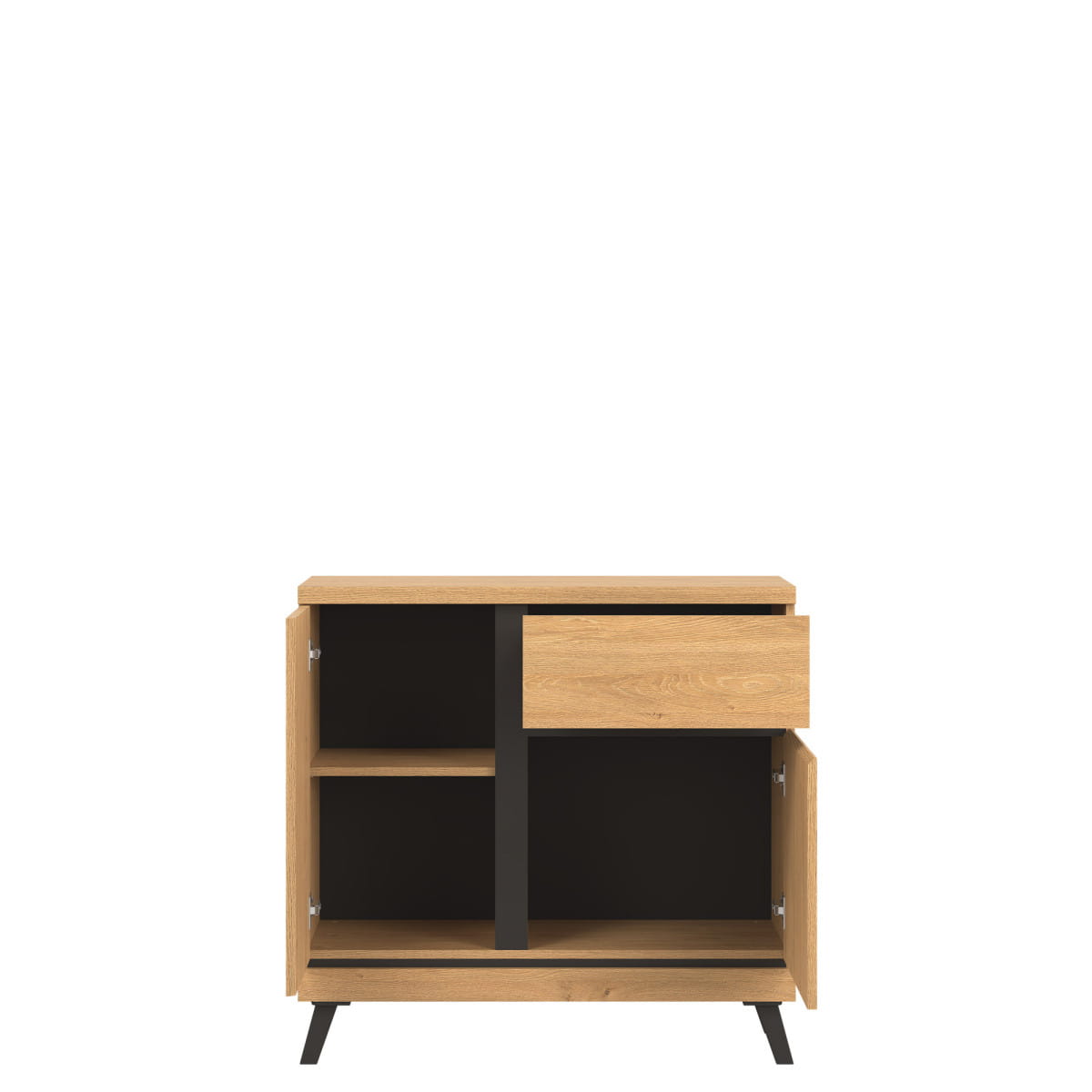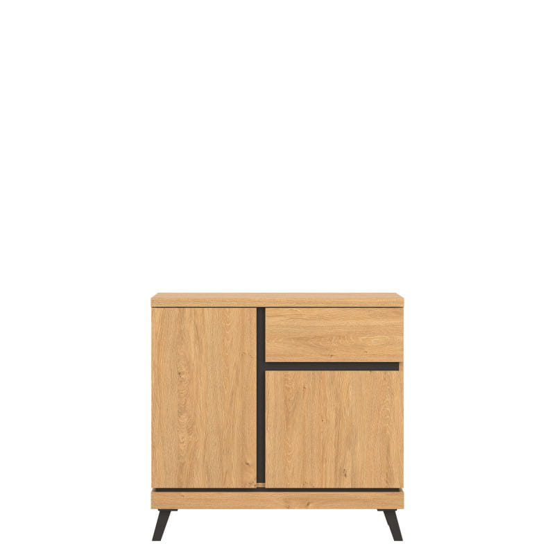 Komoda została wyposażona w szufladę oraz dwie wnęki ukryte za drzwiczkami to funkcjonalne rozwiązanie umożliwi przechowywanie przedmiotów w rozmaity sposób.