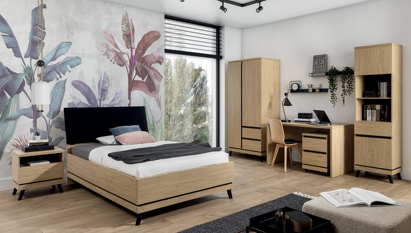 Kolekcja ATE utrzymana jest w modnym kolorze dąb kamienny, który w połączeniu z czarnymi wstawkami zapewnia kontrastowe połączenie, które przyciąga uwagę i nadaje pomieszczeniu elegancji.