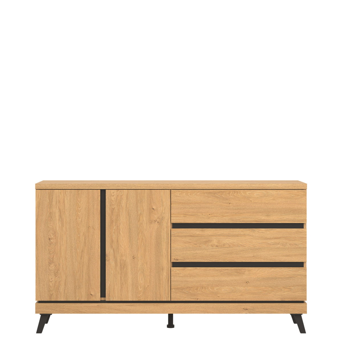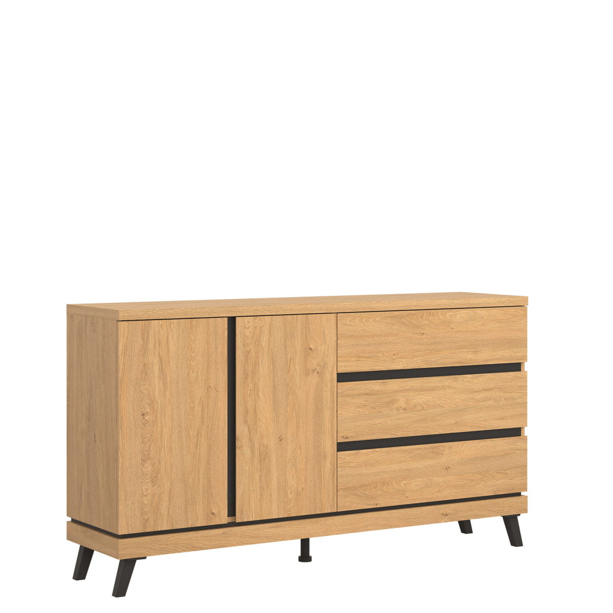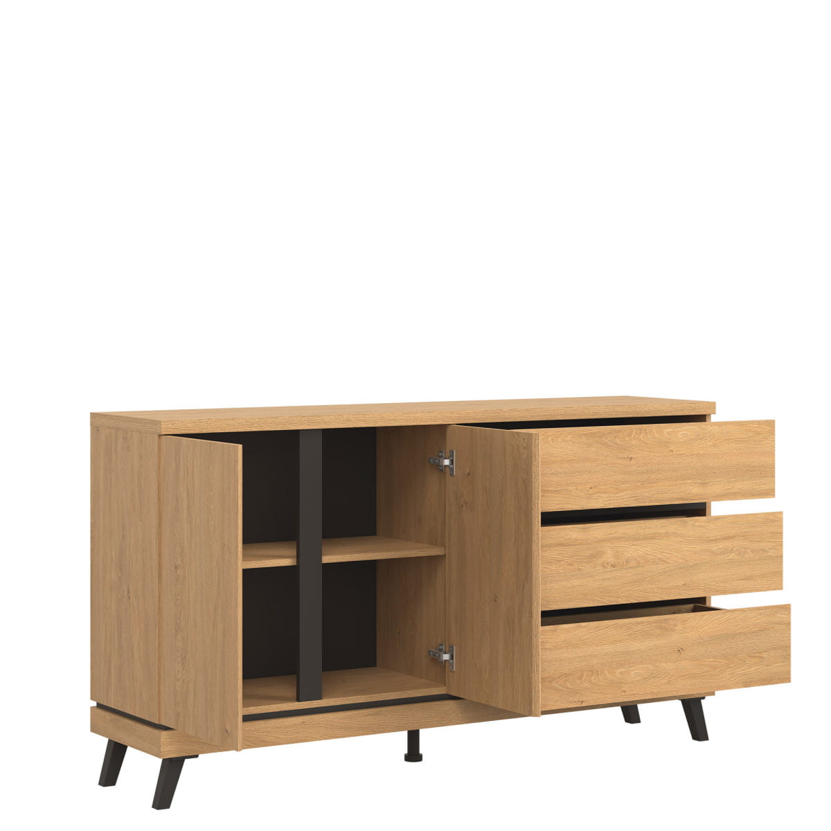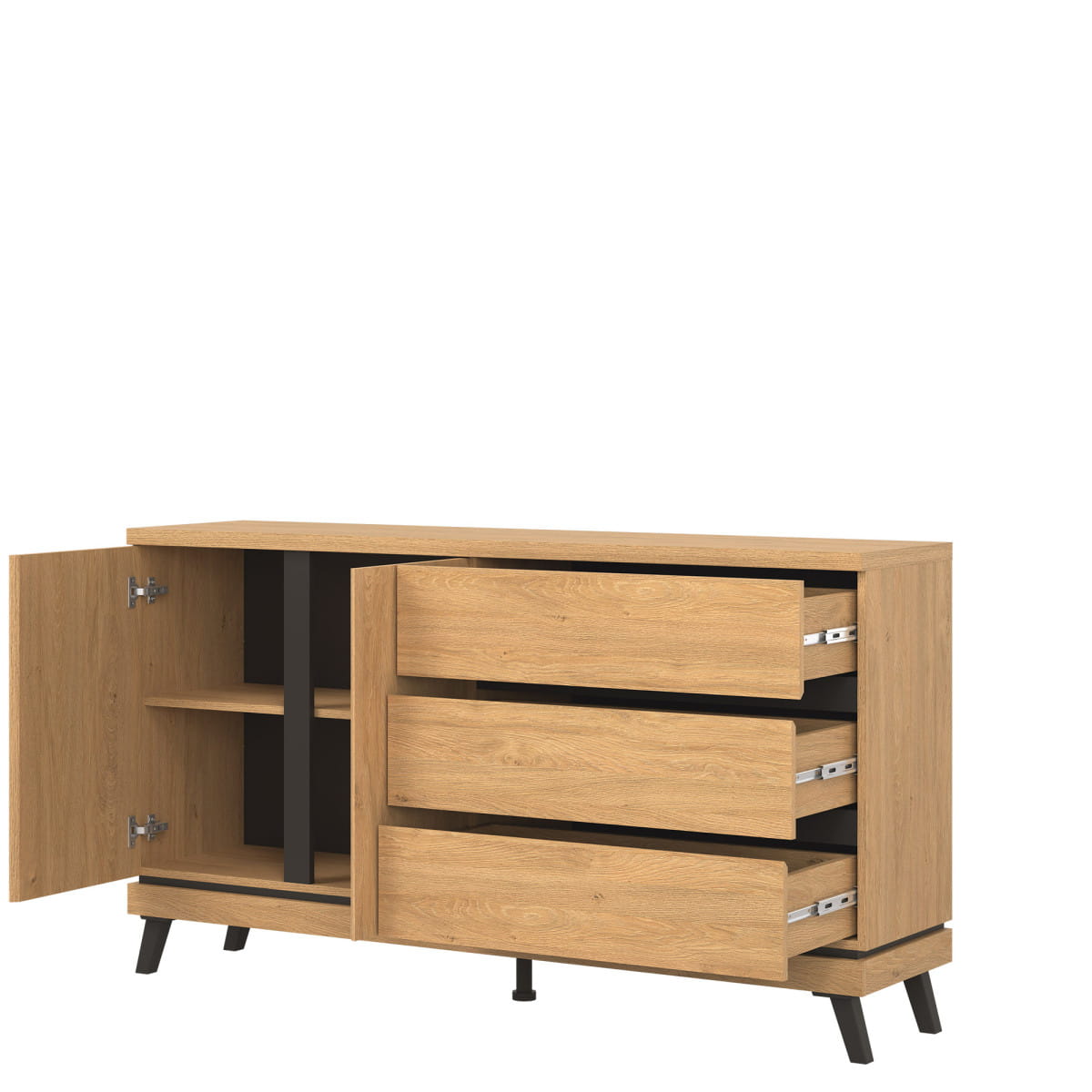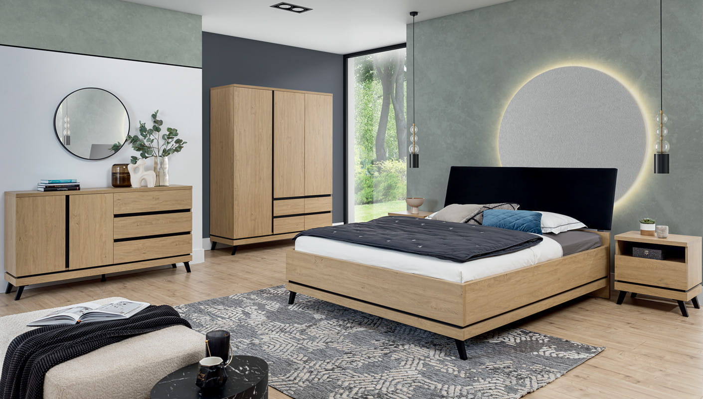 Kolekcja ATE utrzymana jest w modnym kolorze dąb kamienny, który w połączeniu z czarnymi wstawkami zapewnia kontrastowe połączenie, które przyciąga uwagę i nadaje pomieszczeniu elegancji. Mebel otwiera się za pomocą specjalnie wyprofilowanych żłobień na obrzeżu frontu.