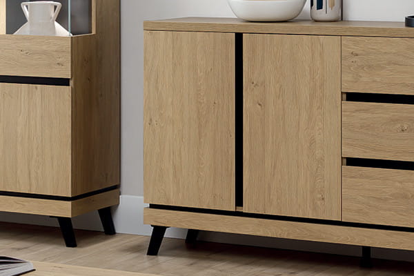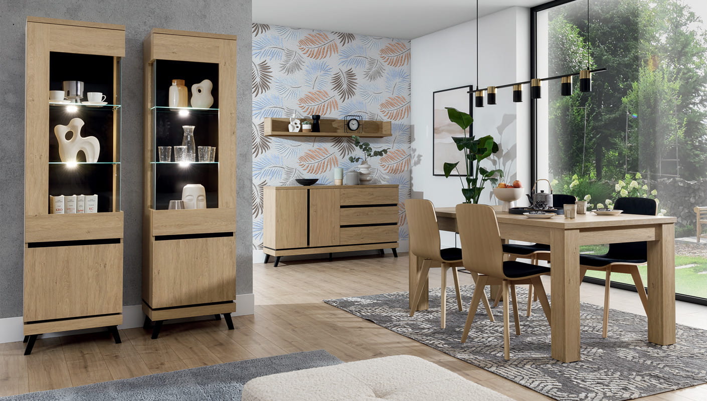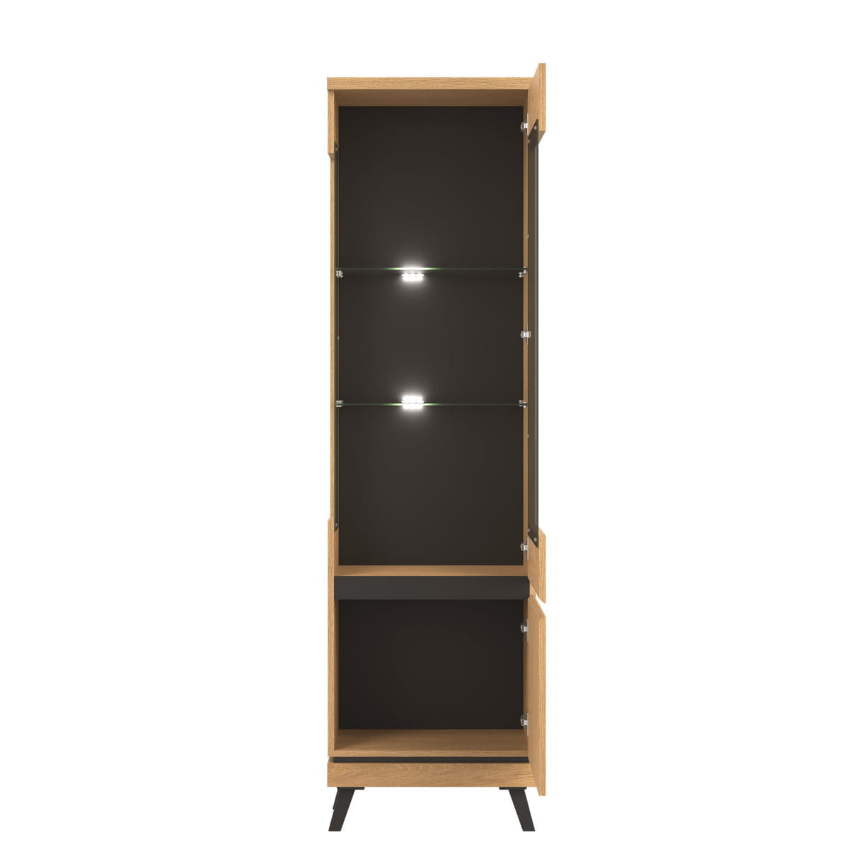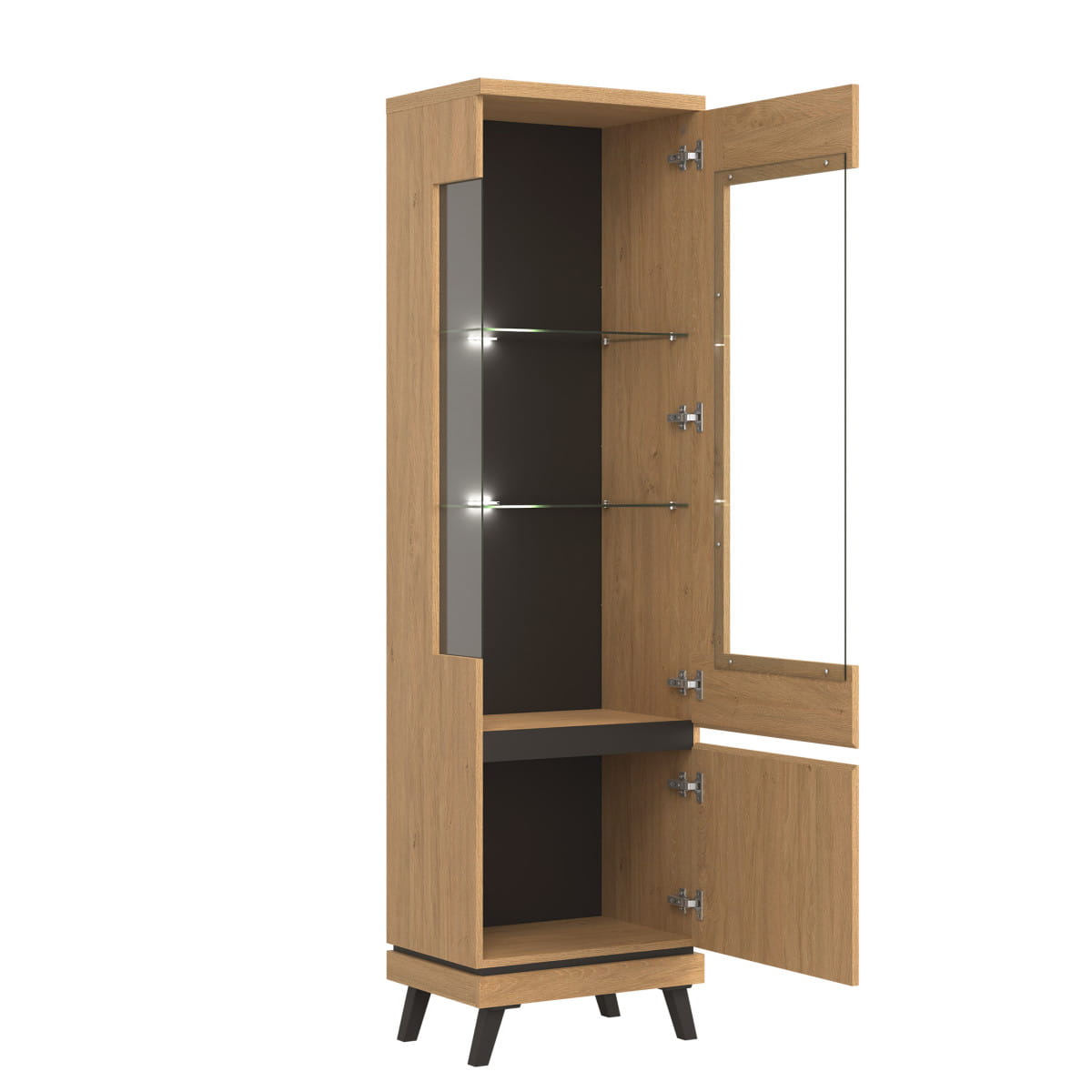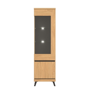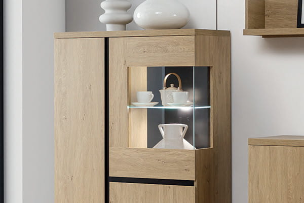 ATE AT06 WITRYNA PRAWOSTRONNA Witryna prawa ATE AT06 znajdzie swoje miejsce w salonie, sypialni oraz pokoju dziennym. Na dwóch szklanych półkach za częściowo przeszklonym frontem można ustawić dekoracje, które mogą zostać podświetlone za pomocą LED (opcja). Poniżej za pełnymi drzwiami znajduje się wnęka na pozostałe przedmioty. Kolekcja ATE utrzymana jest w modnym kolorze dąb kamienny, który w połączeniu z czarnymi wstawkami zapewnia kontrastowe połączenie, które przyciąga uwagę i nadaje pomieszczeniu elegancji. Mebel otwiera się za pomocą specjalnie wyprofilowanych żłobień na obrzeżu frontu. Witryna prawa idealnie sprawdzi się w konfiguracji z innymi bryłami z serii ATE lub jako pojedynczy mebel, który można dopasować do własnej aranżacji pomieszczenia. Opis Szerokość 54,5 cm Głębokość 39 cm Wysokość 197 cm Waga brutto 45,85 kg Waga netto 43,42 kg Kod / symbol producenta at06 Nóżki / kolor plastikowa bez regulacji Ilość paczek produktu 3 Styl nowoczesny Wyposażenie instrukcja montażu / akcesoria montażowe Montaż do samodzielnego montażu Korpus kolorystyka dąb kamienny / czarny Korpus wykonanie materiał / rodzaj / grubość płyta wiórowa laminowana 16 mm Ściana tylna część widoczna kolorystyka czarny Front kolorystyka dąb kamienny Front wykonanie materiał / rodzaj / grubość płyta wiórowa laminowana 16 mm Front przeszklony wykonanie i kolorystyka szkła hartowane bezbarwne Front przeszklony grubość szkła 4 mm Półka szklana kolorystyka bezbarwna Półka szklana grubość szkła 5 mm Półka szklana ilość 2 Podświetlenie w opcji Podświetlenie barwa światła biała ciepła Podświetlenie klasa energetyczna a++ Uchwyt wykonanie frezowany Ilość drzwi 2
