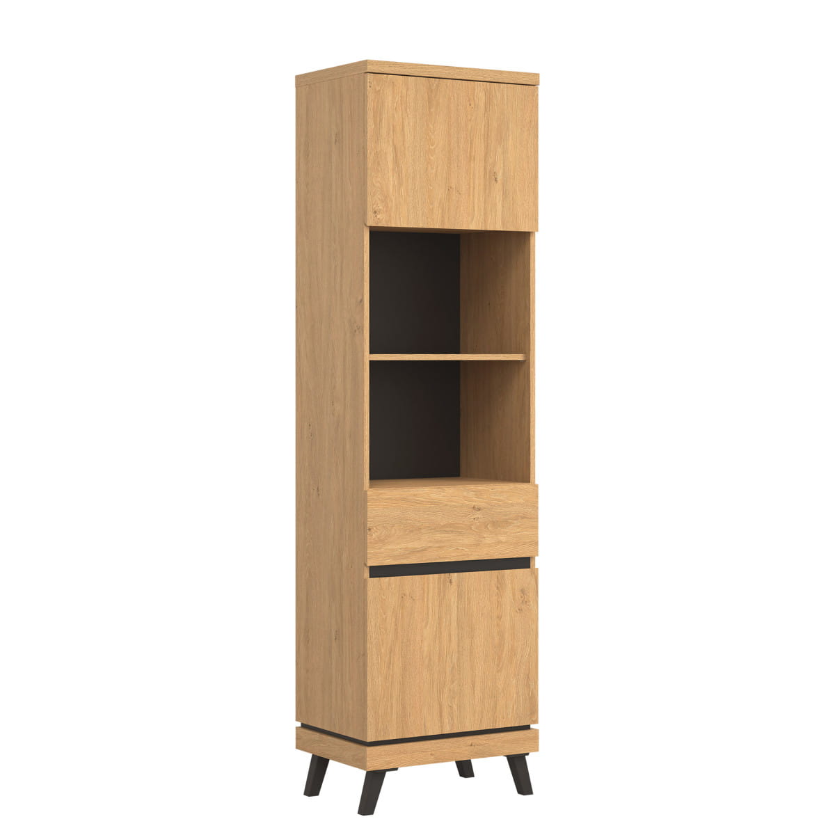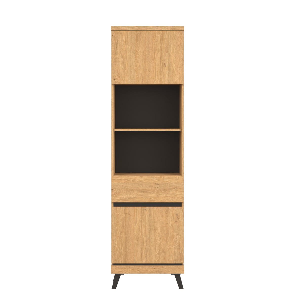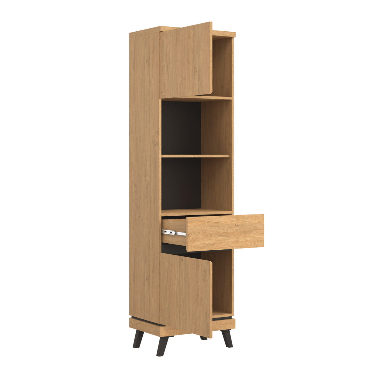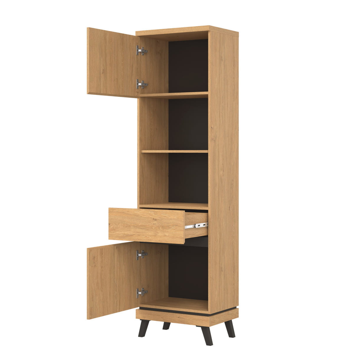 Górną i dolną część regału stanowi szafka z pełnymi drzwiczkami, doskonała do przechowywania dokumentów czy drobnych elementów garderoby.