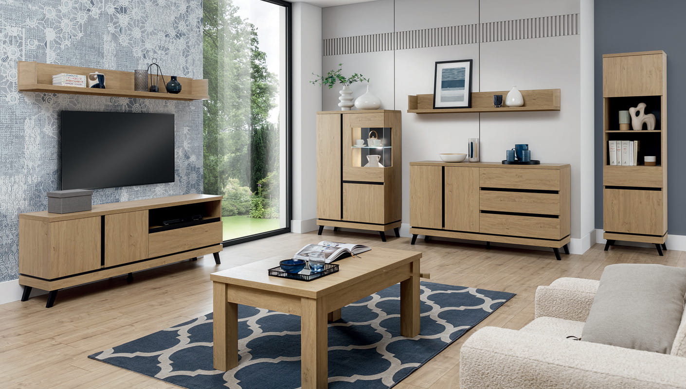 Całość jest w tym samym w kolorze: dąb kamienny. Mebel otwiera się za pomocą specjalnie wyprofilowanych żłobień na obrzeżu frontu.