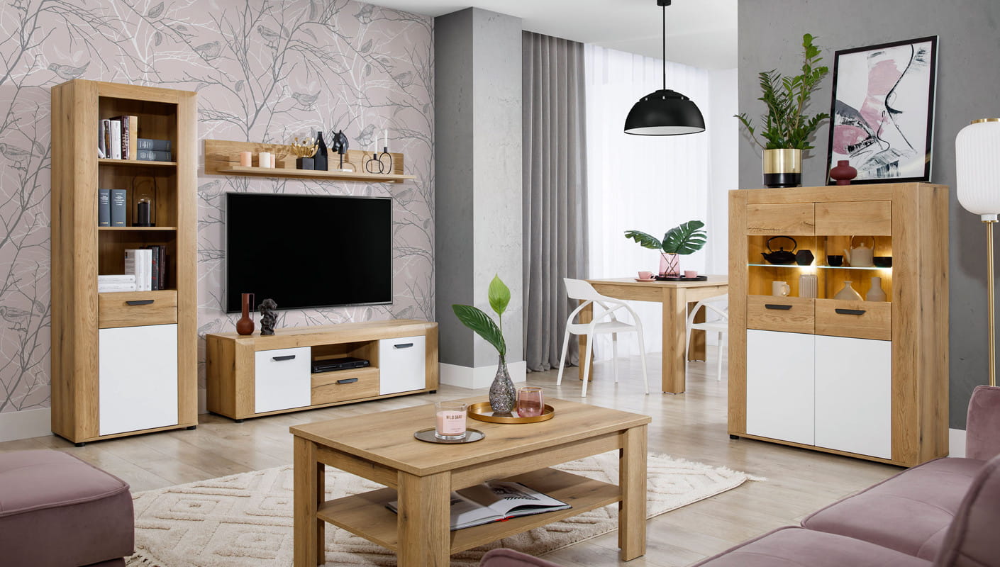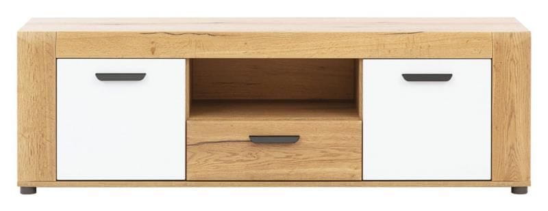 Dzięki szufladzie oraz dwóm pojemnym wnękom pomieści wszystkie urządzenia elektroniczne i drobne akcesoria. Na blacie można postawić telewizor lub pięknie wyeksponować dekoracje. Jasne drewno, białe fronty i proste grafitowe uchwyty idealnie pasują do wnętrz jasnych, wzbogaconych drewnianymi elementami dekoracyjnymi. Szafka RTV idealnie sprawdzi się w kompozycji z innymi bryłami z serii BESTO lub jako pojedynczy mebel, który można dopasować do własnej aranżacji pomieszczenia.