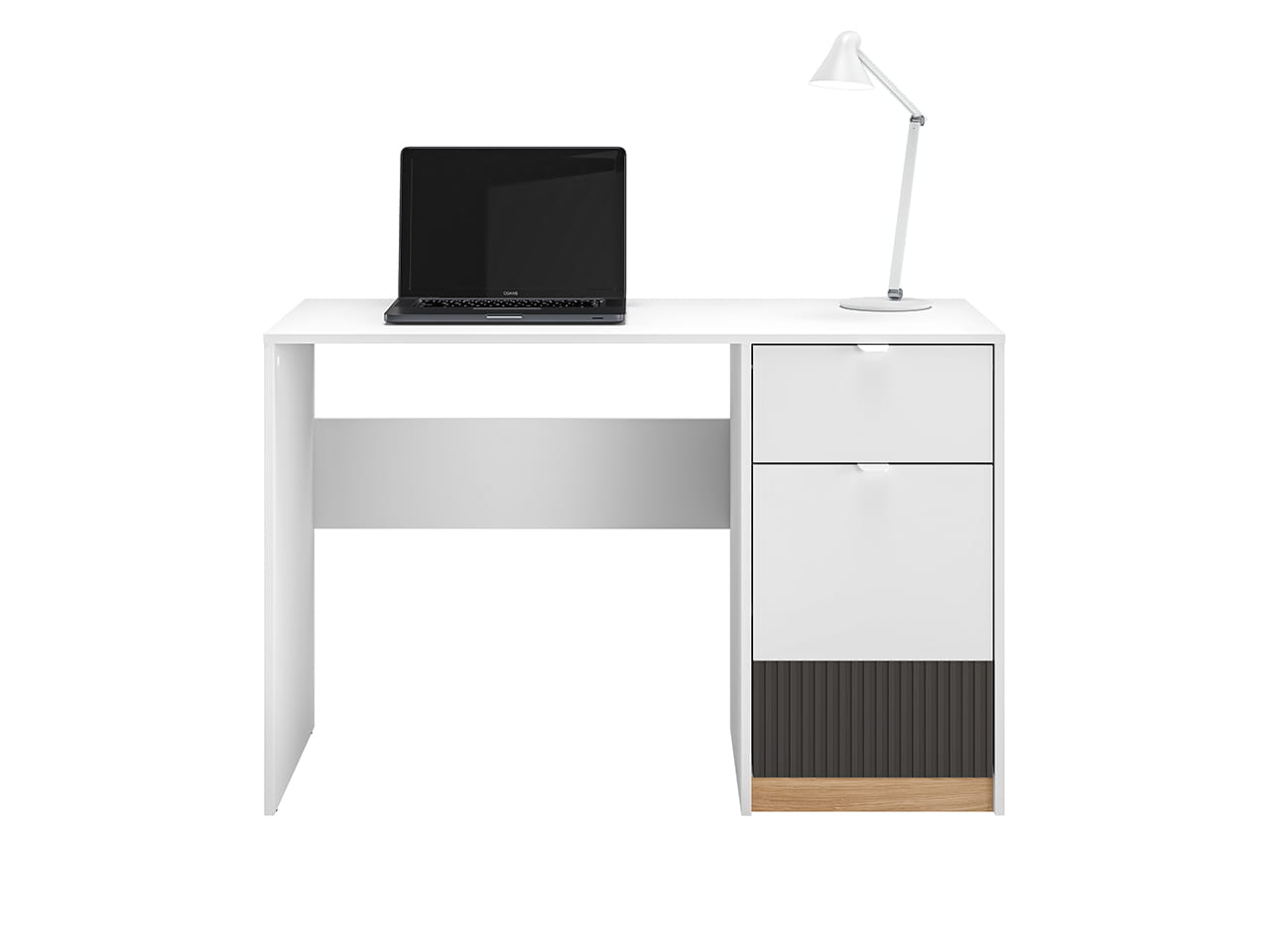 Styl: Nowoczesny i uniwersalny design w kolorze białym z elementami w kolorze dębu i grafitu, który łatwo dopasuje się do różnych aranżacji wnętrz.