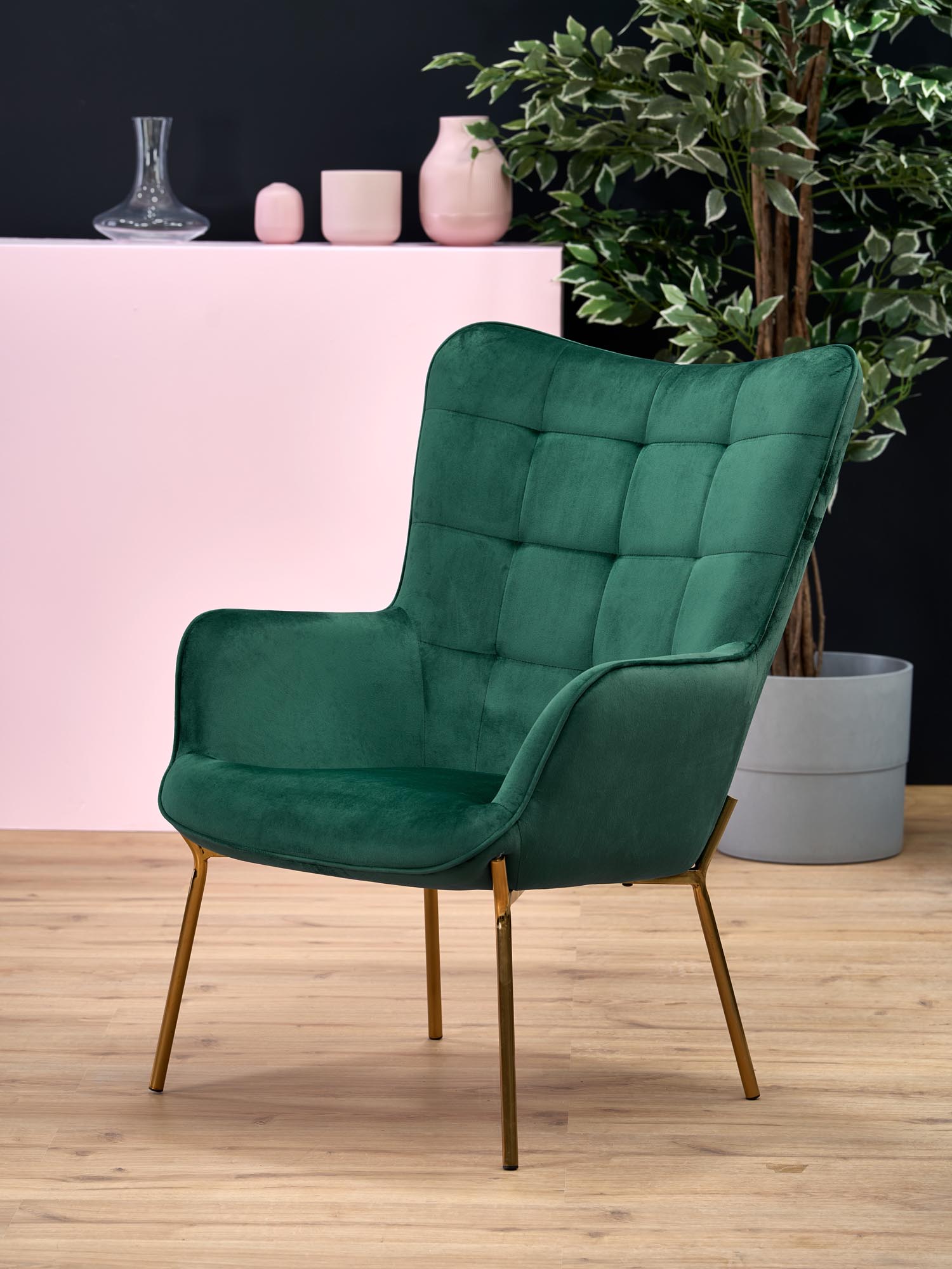 Prezentujemy fotel wypoczynkowy CASTEL 2 od marki HALMAR, który jest kwintesencją elegancji i wygody. Dzięki połączeniu ciemnozielonej tapicerki z tkaniny BLUVEL78 z lśniącymi, złotymi nogami, ten fotel stanowi wyjątkowy dodatek do każdego wnętrza, wprowadzając do niego odrobinę luksusu.