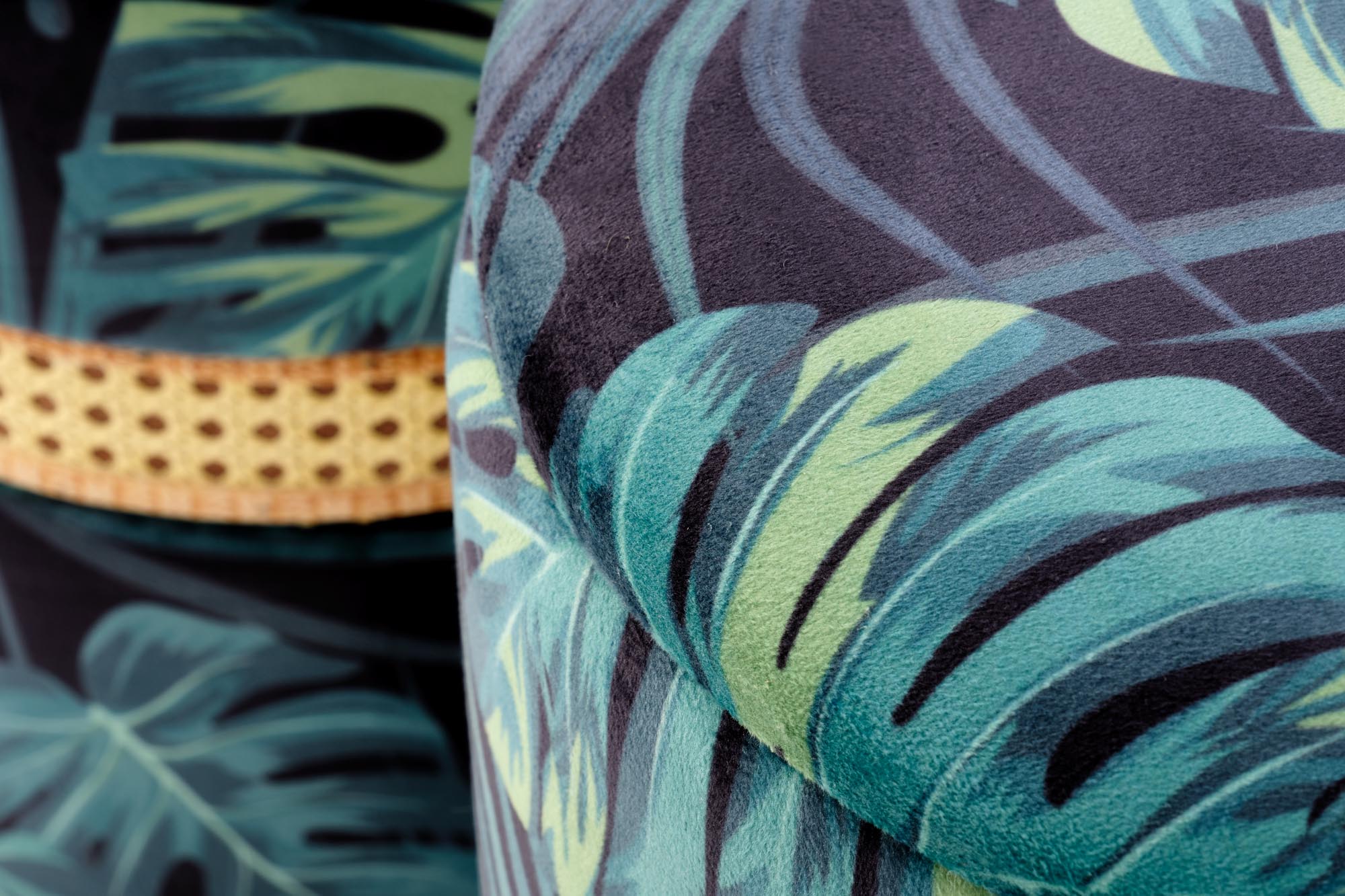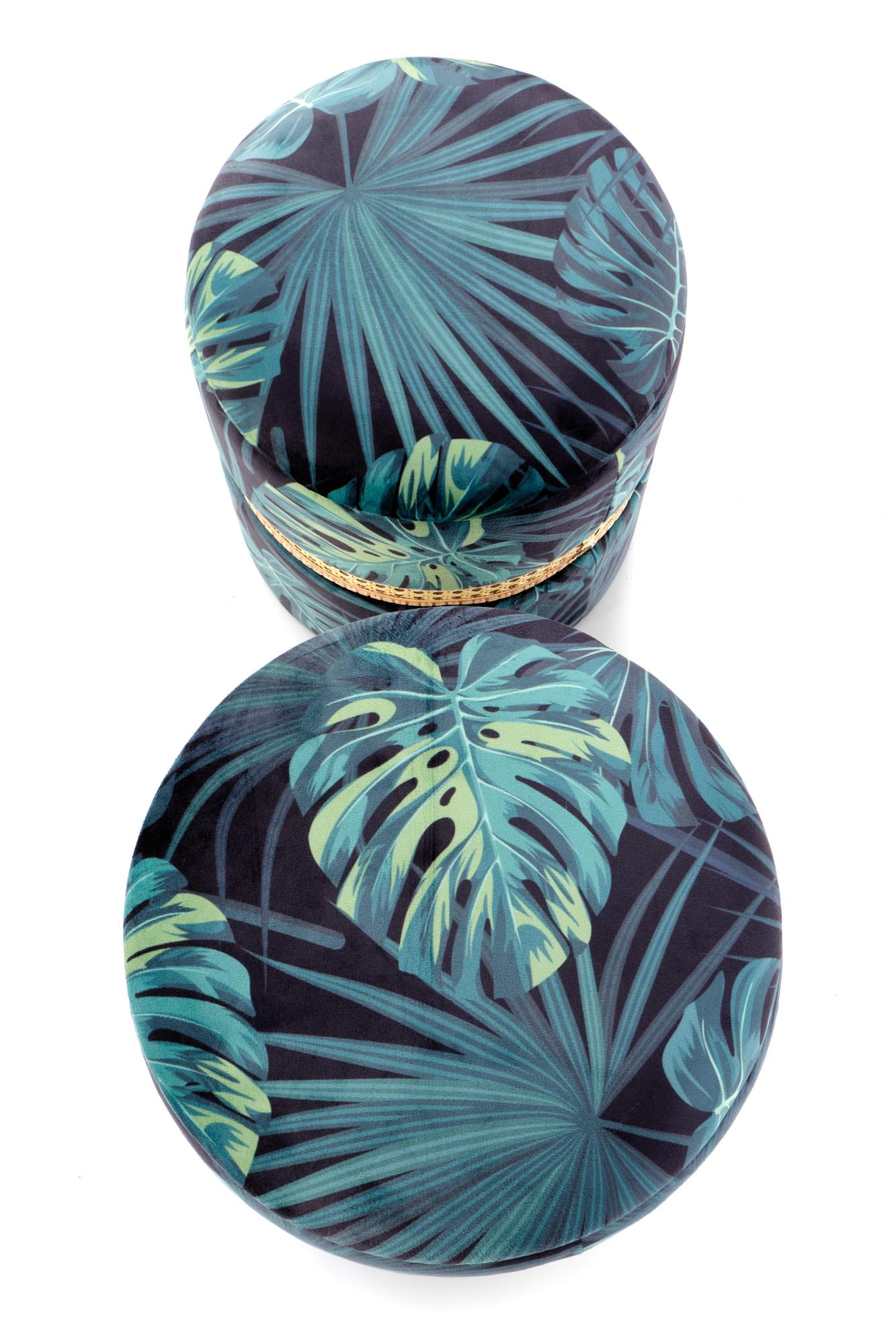 wymiary: h44/fi36 oraz h38/fi32 cm, zestaw 2 puf z funkcją pojemnika, materiał: tkanina / rattan syntetyczny, kolor: wielobarwny