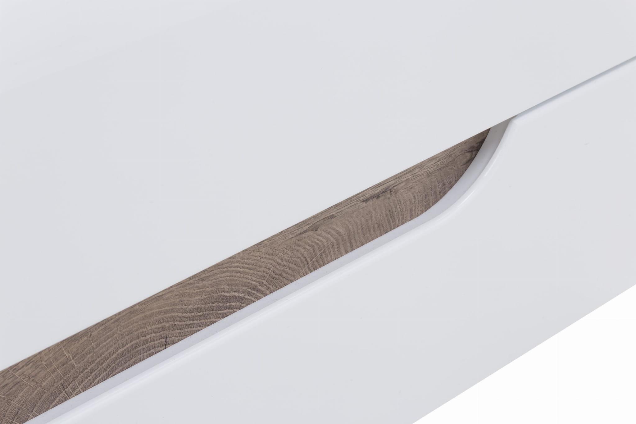 Efektowne podfrezowania na frontach, które zastąpiły tradycyjne uchwyty podkreślają swym kształtem całość stylistyki szafki.