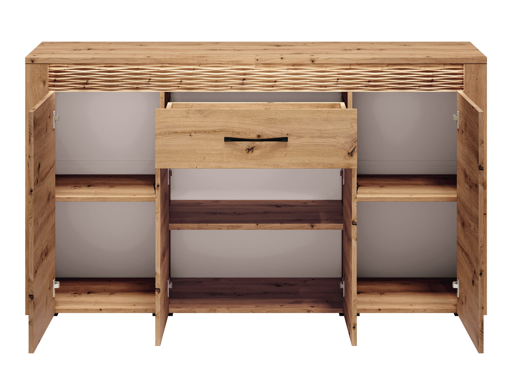 Komoda czterodrzwiowa z drzwiczkami po bokach i po jednej półce z płyty meblowej.