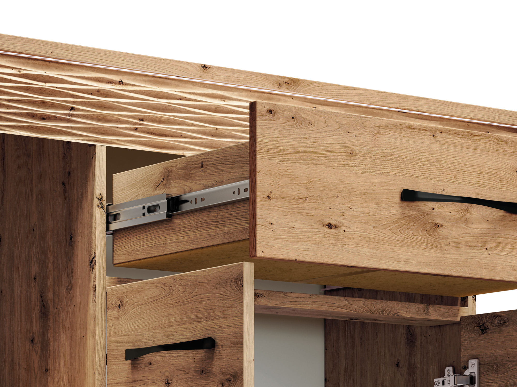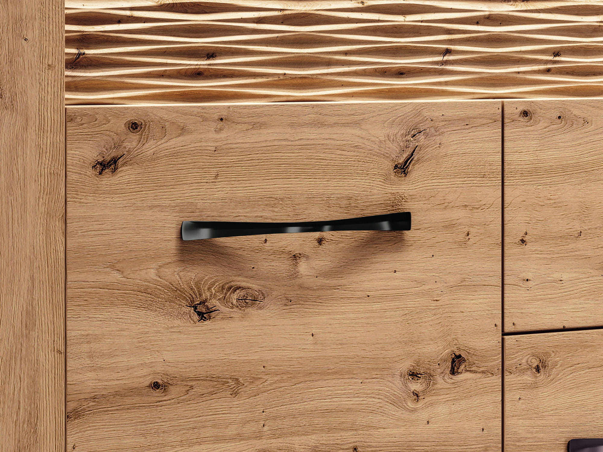 Czarne, metalowe uchwyty świetnie kontrastują z ciepłym dekorem dębu, a podświetlana, dekoracyjna ryfla doda Twojemu wnętrzu blasku i niepowtarzalnego klimatu.