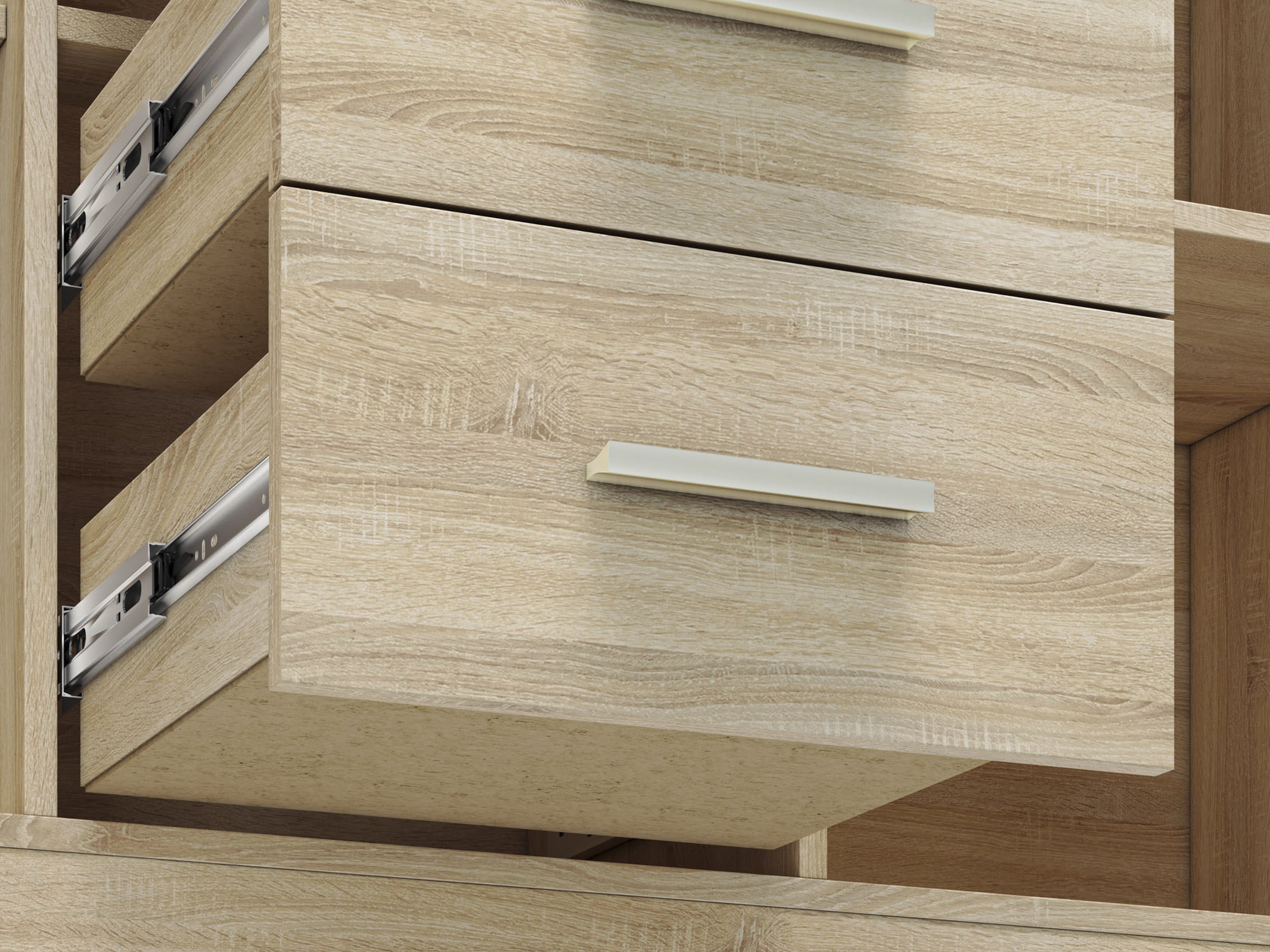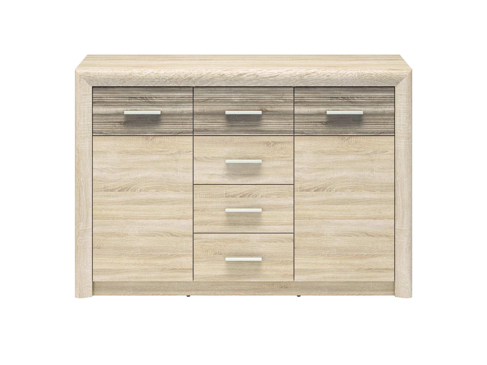 Kolekcja CASTEL wyróżnia się nowoczesną stylistyką oraz oryginalną formą w bardzo modnym kolorze Sonoma Jasna, który został połączony z ryflowaną wstawką MDF w kolorze Sonoma Truflowa. Szerokie, zaokrąglone listwy MDF okalające korpus akcentują to, co w tym projekcie najważniejsze – solidność z delikatnością, która sprawdzi się w każdym domowym wnętrzu. Kolekcja CASTEL to meble idealne do salonu, jadalni oraz pokoju młodzieżowego. System został wykonany z wysokiej jakości płyty laminowanej, co zapewnia praktyczność oraz swobodę w aranżowaniu wymarzonego wnętrza.