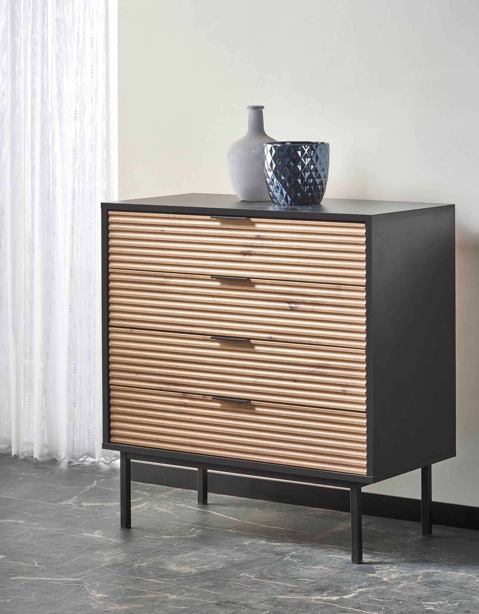 - Kolor: Komoda dostępna w eleganckim połączeniu dąbu artisan i czerni.