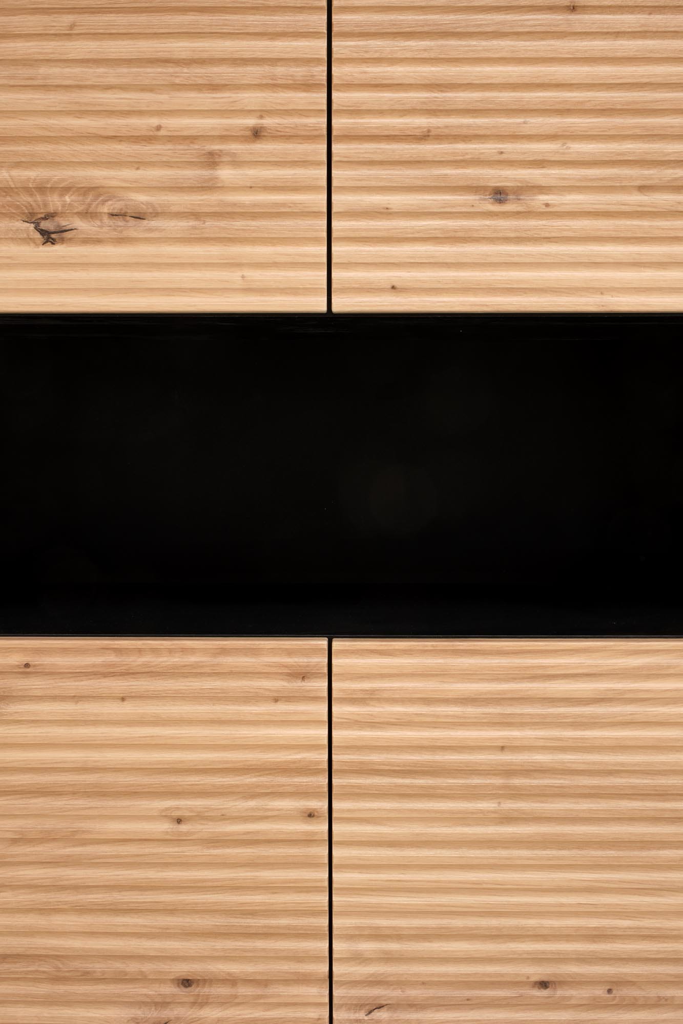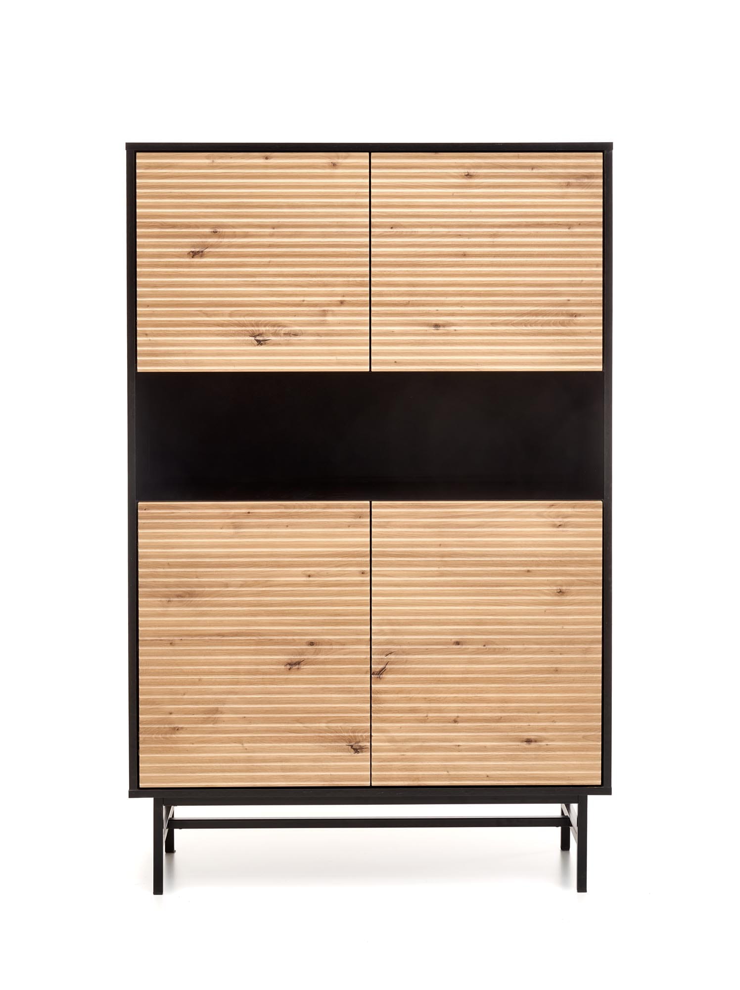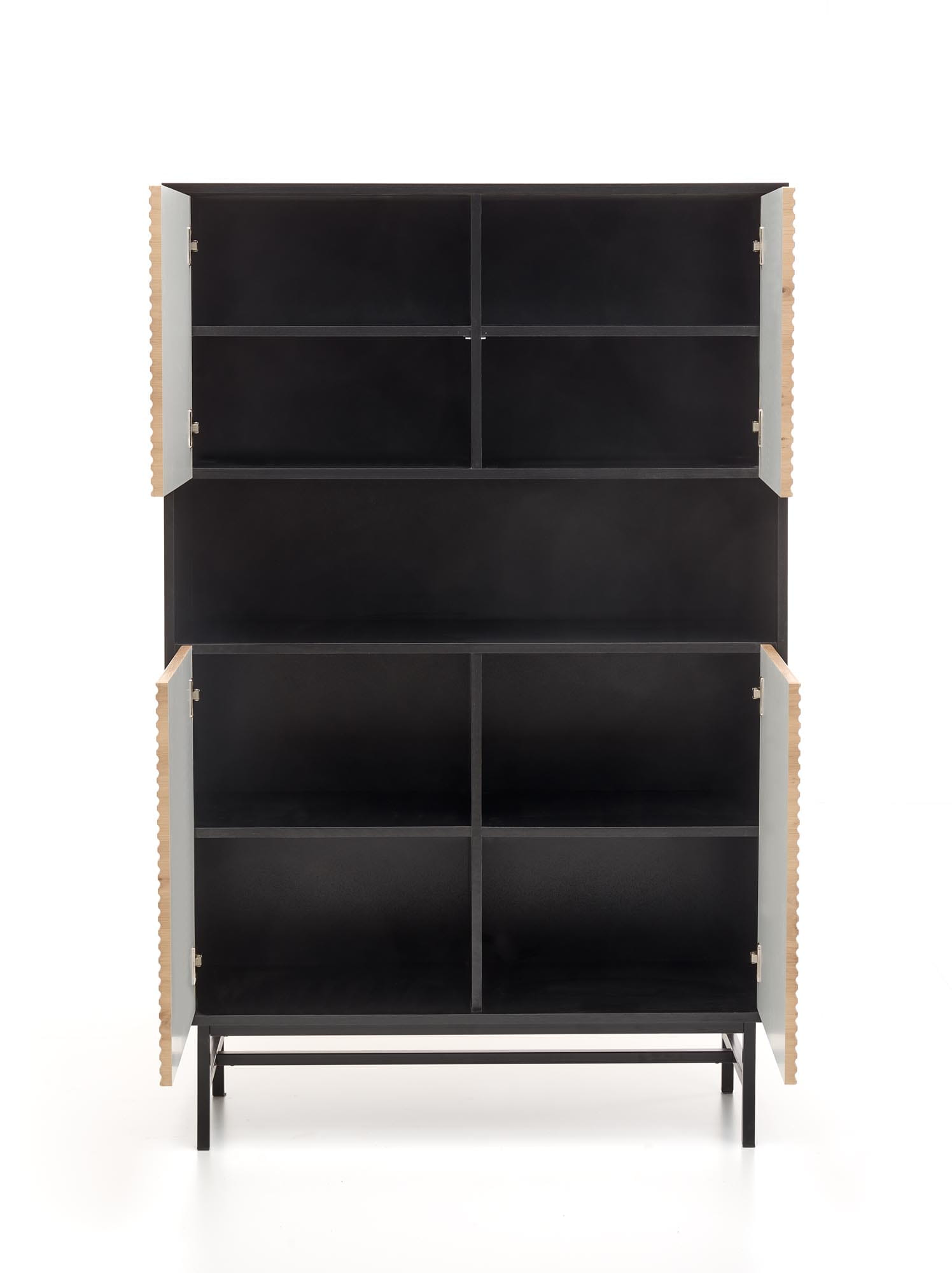 Komoda MURANO KM-3 posiada cztery półki ukryte za podwójnymi drzwiczkami oraz trzy szuflady ułożone jedna pod drugą. Metalowe, subtelne uchwyty ułatwiają otwieranie poszczególnych elementów. To mebel, który nie tylko zachwyca swoim wyglądem, ale także oferuje praktyczne rozwiązania do przechowywania.