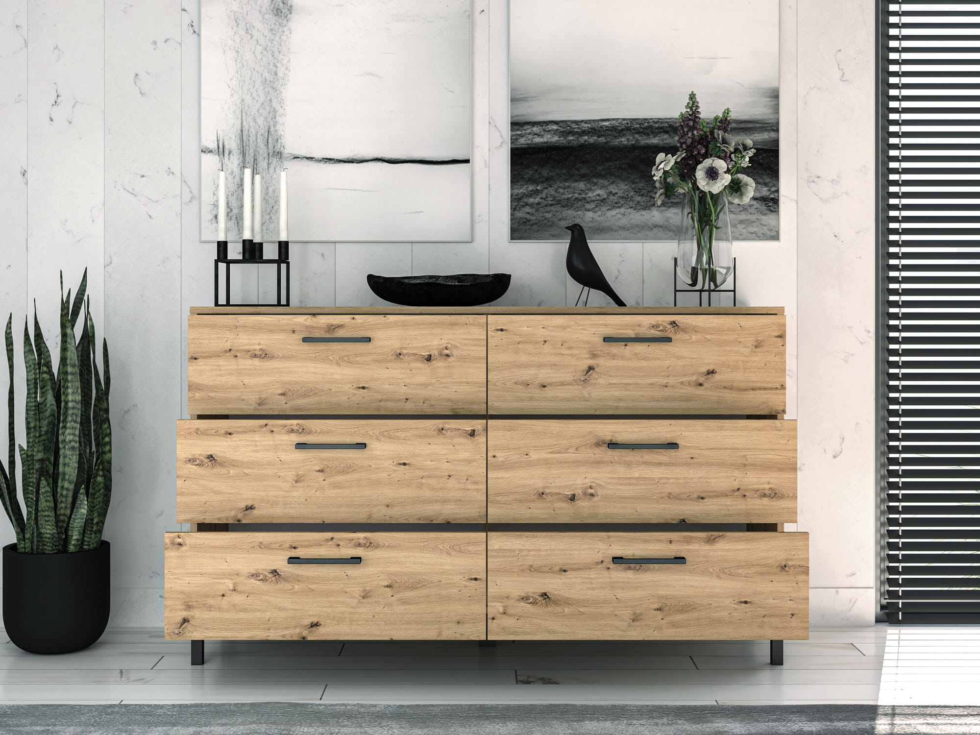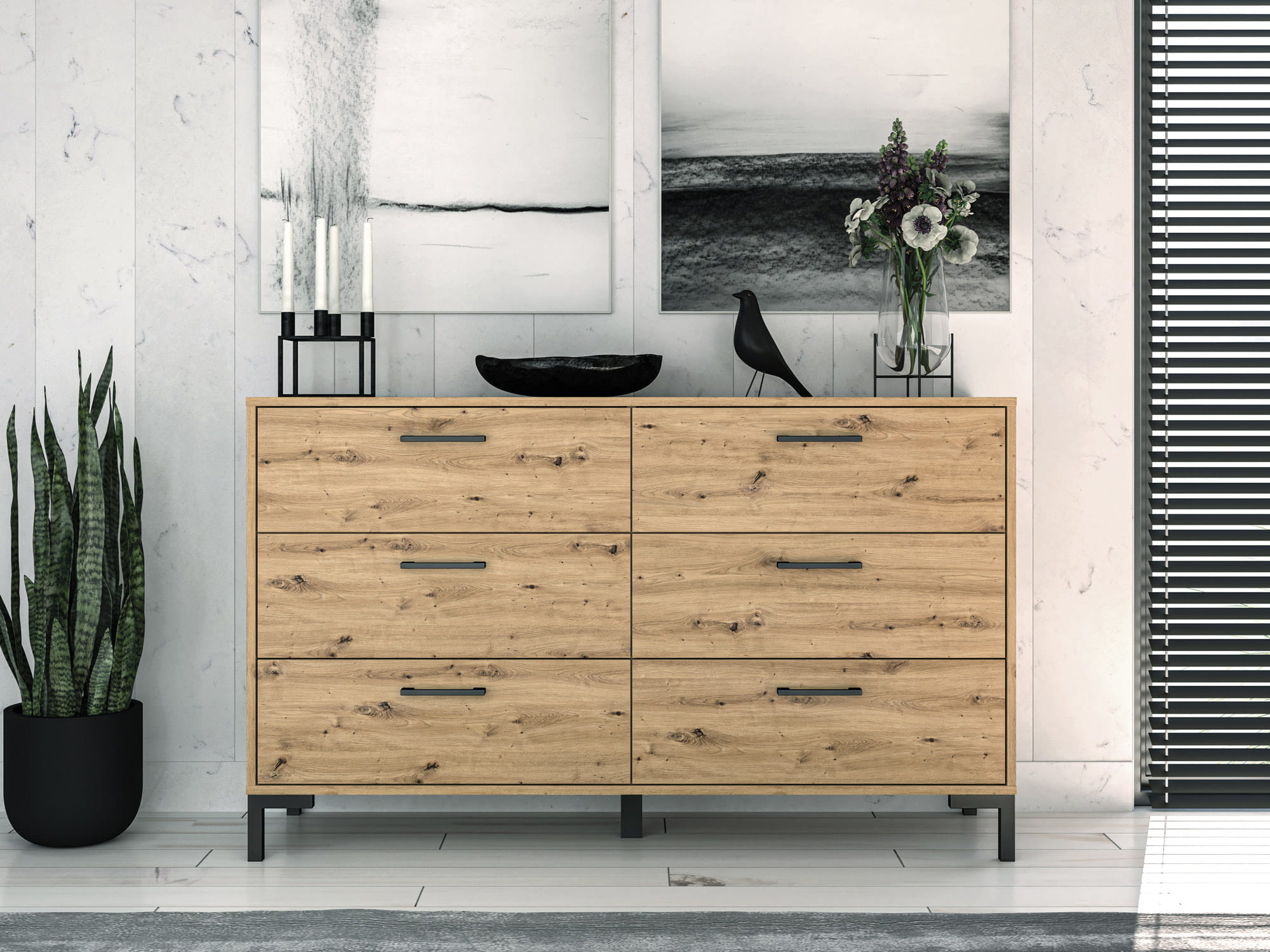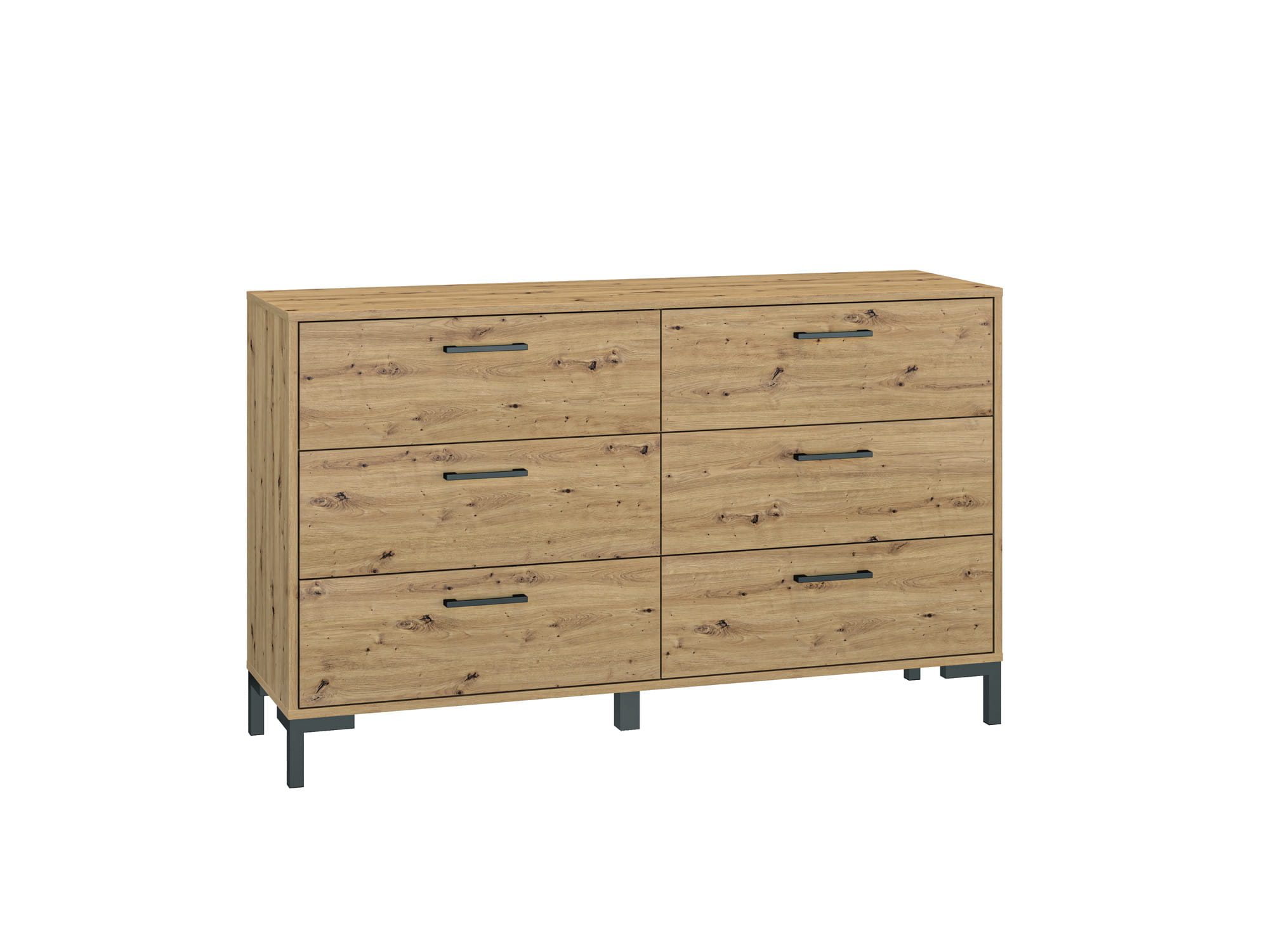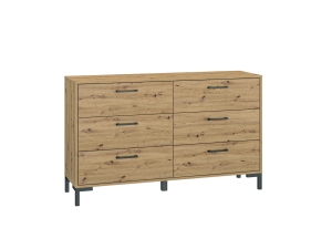 Komoda NEVIO 11 to niezwykle praktyczne rozwiązanie do każdego wnętrza. Pięknie usłojony dekor w kolorze Dąb Artisan oraz czarne elementy w postaci uchwytów i nóżek tworzą nietuzinkowe połączenie. Komoda dzięki swojej funkcjonalności jest doskonałym miejscem do ekspozycji zdjęć, czy pamiątek rodzinnych. Bardzo pojemne szuflay są idealnym rozwiązaniem do umieszczenia ubrań oraz akcesoriów. Dodatkowo utrzymanie czystości nigdy nie było tak łatwe, dzięki wysokim nóżkom pod którymi zmieści się końcówka odkurzacza klasycznego, robot jeżdżący czy mop.