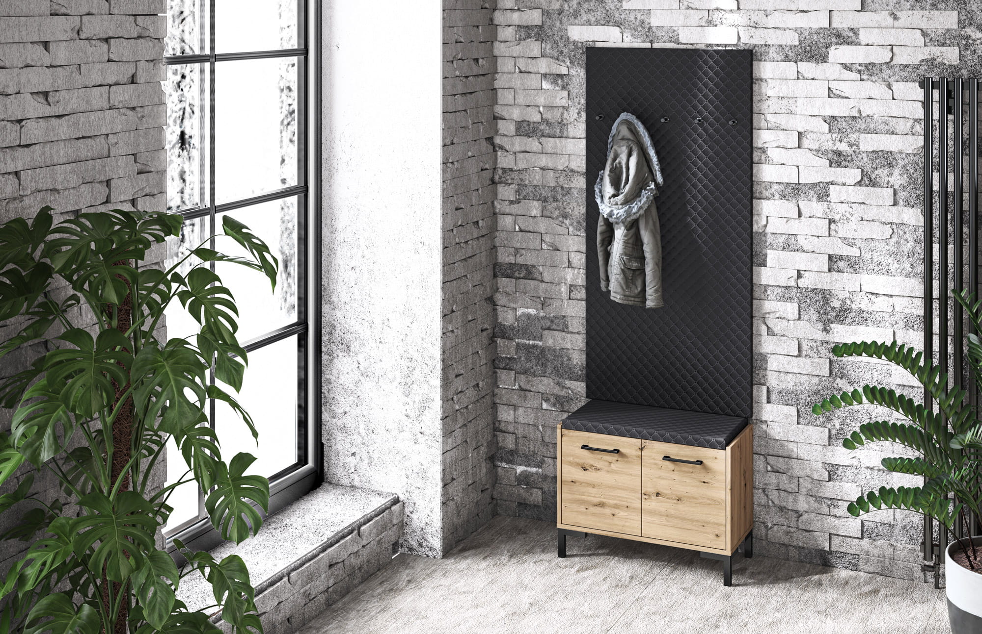 NEVIO to nowoczesna i elegancka kolekcja mebli do przedpokoju. Dekor Dąb Artisan wraz z czarnymi uchwytami oraz nóżkami jest idealnym rozwiązaniem do współczesnego wnętrza. Przemyślana konstrukcja brył zapewni miejsce do przechowywania butów oraz ubrań. Miękkie, tapicerowane siedziska oraz wieszak gwarantują komfort użytkowania. Dzięki różnorodności mebli NEVIO z łatwością zaaranżujesz zarówno małe, jak i duże wnętrze.