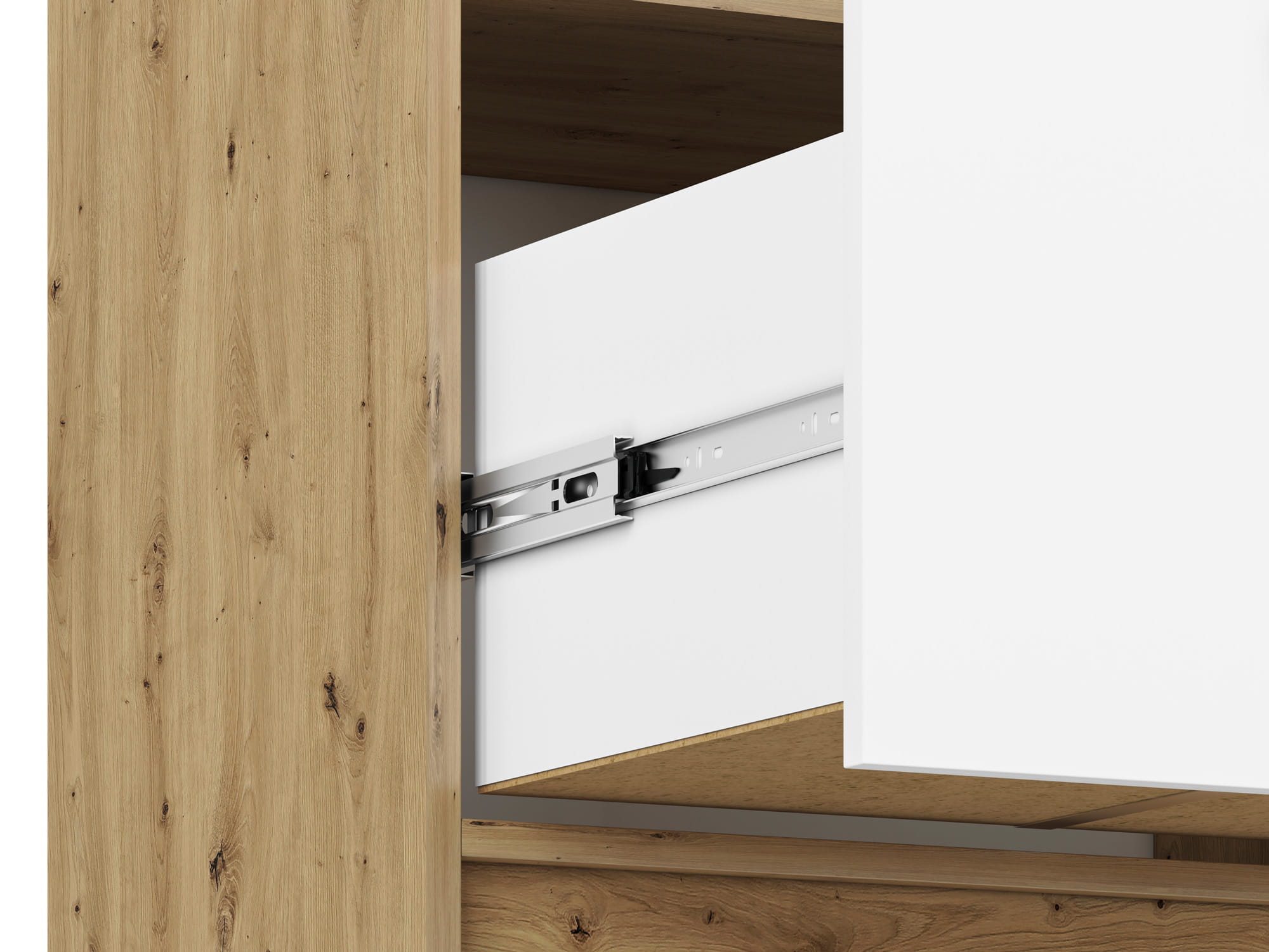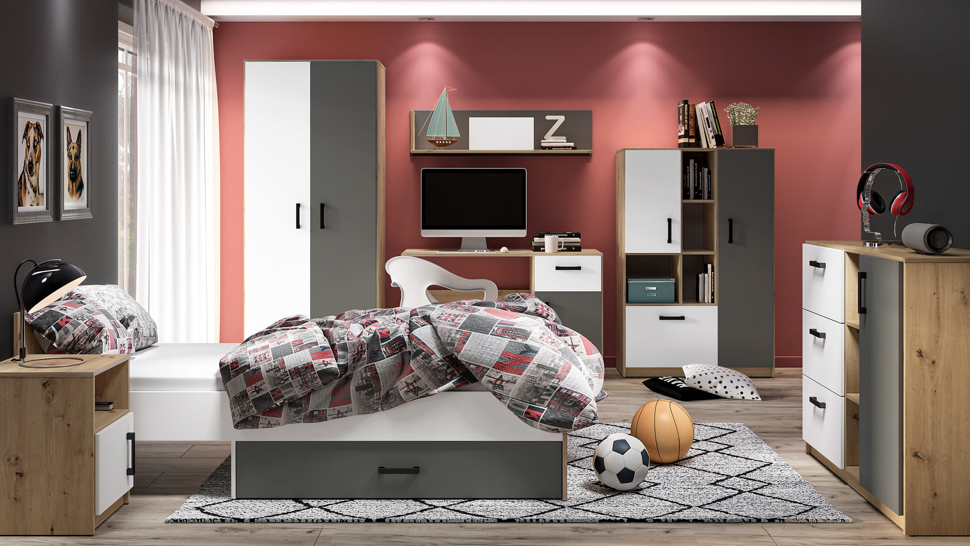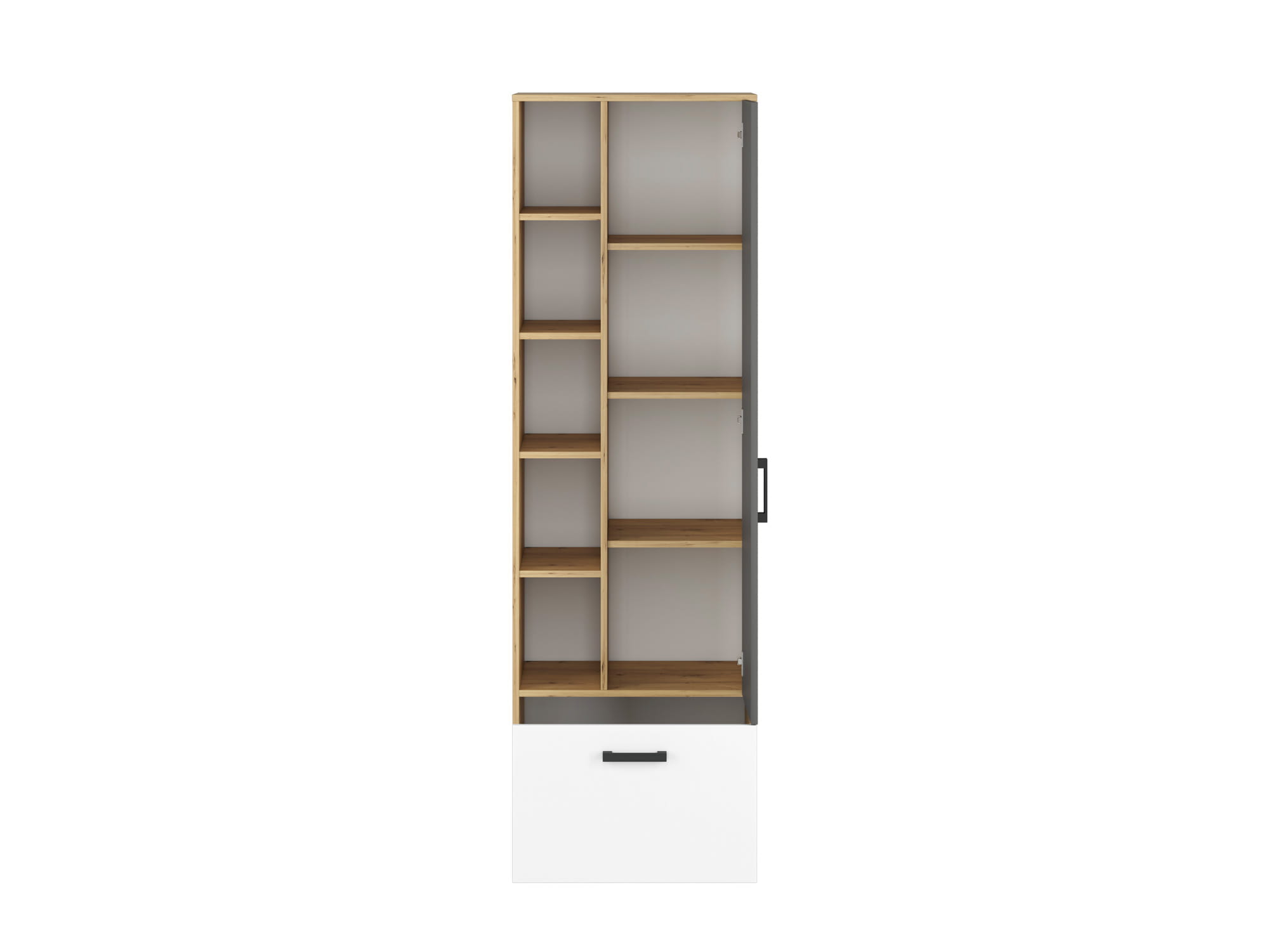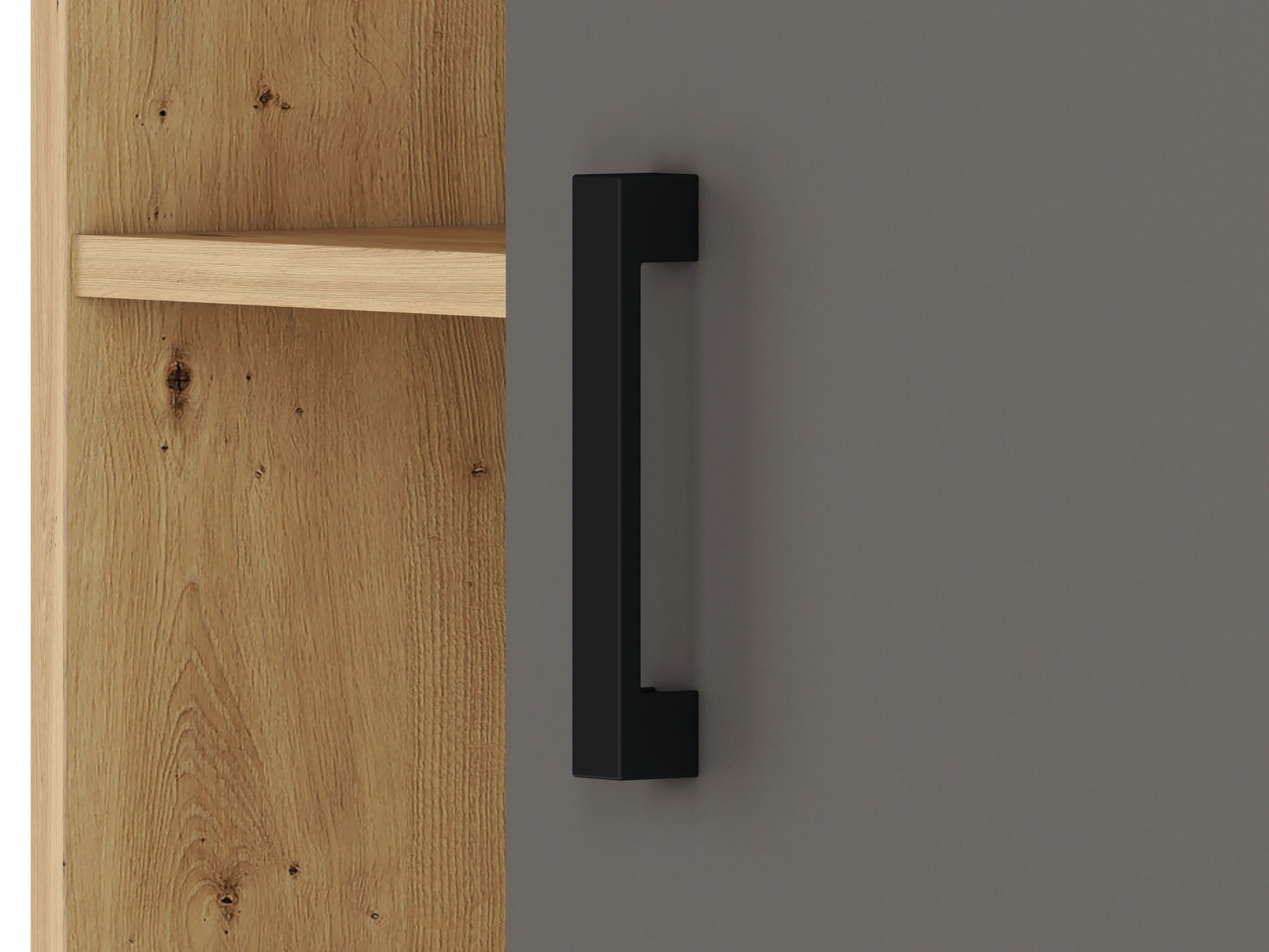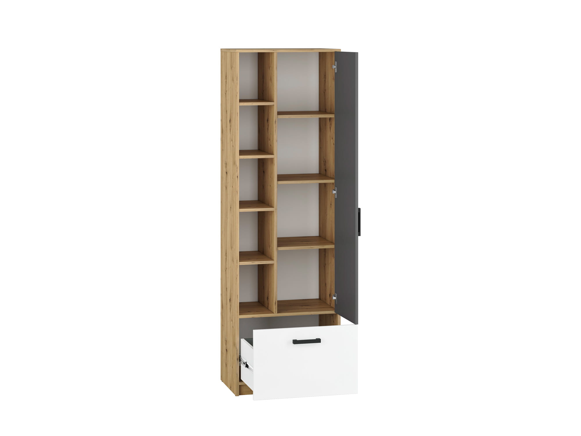 Kolekcja FINI to oryginalne i proste w formie bryły w modnych dekorach. Nowoczesna i zdecydowana kombinacja kolorów - białego alpejskiego i antracytowego z klasycznym dekorem Dąb Artisan odzwierciedla dynamiczny temperament nastolatków. Geometria frontów i korpusów tworzy efekt porządku, spójności oraz młodzieżowej elegancji. Kontrastujące czarne uchwyty podkreślają nieprzeciętność mebli FINI.