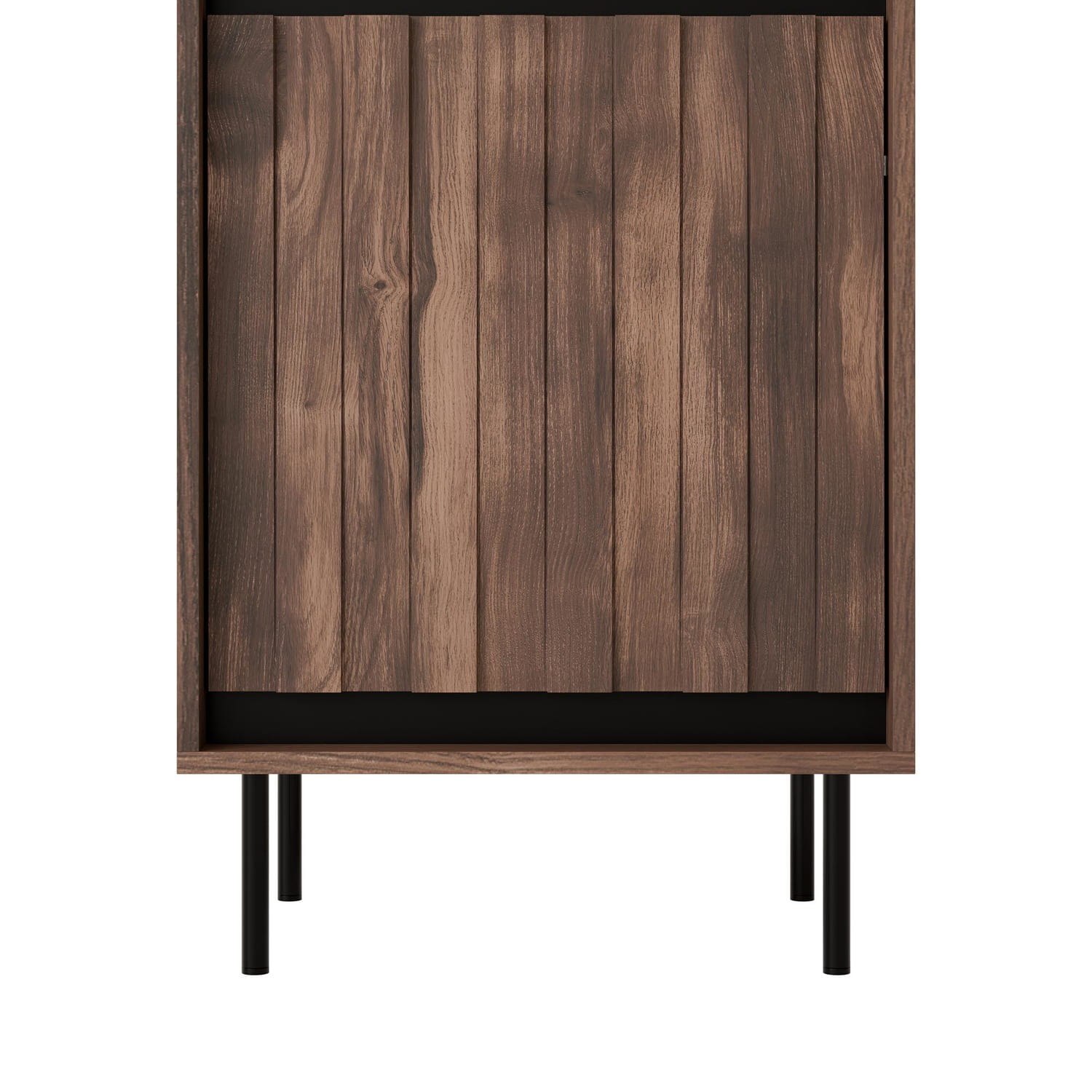Kolekcja mebli skrzyniowych Swing to nie tylko zwykłe meble, to prawdziwe dzieła sztuki, które wniosą do Twojego wnętrza niepowtarzalny charakter i elegancję. Wykonane z wysokiej jakości płyty meblowej laminowanej, gwarantują trwałość i solidność na lata. Fronty w orzechowym wykończeniu ze strukturą 3D nadają meblom unikalny i efektowny wygląd. To nie tylko meble do przechowywania, to prawdziwa ozdoba przestrzeni, która przyciąga uwagę i dodaje wnętrzu niepowtarzalnego uroku. Matowa czerń w połączeniu z orzechowymi detalami tworzy harmonijną kompozycję, nadając pomieszczeniu nowoczesnego i stylowego charakteru. To połączenie klasycznej elegancji z nowoczesnym designem. Stalowe nóżki dodają lekkości i finezji, jednocześnie nadając meblom lekkiego, unoszącego się charakteru. To nie tylko funkcjonalność, ale również wyjątkowy design, który wzbogaci Twoje wnętrze. Kolekcja składa się z różnorodnych elementów, od szafy po witrynę, od ławy po komodę niską i wysoką, aż po szafkę RTV. To kompleksowe rozwiązanie dla każdego pomieszczenia, zapewniające nie tylko praktyczność, ale także estetyczne doznania.