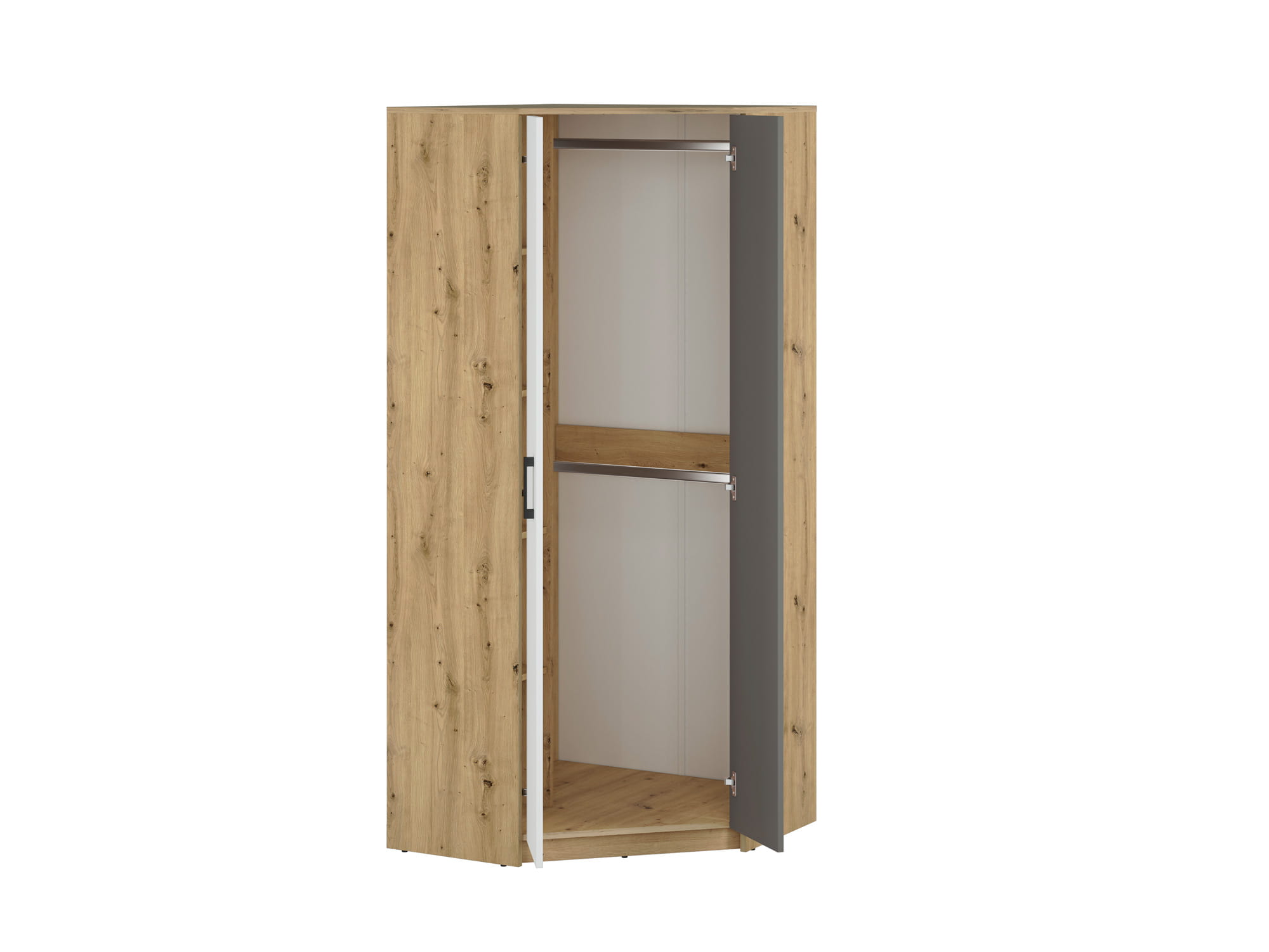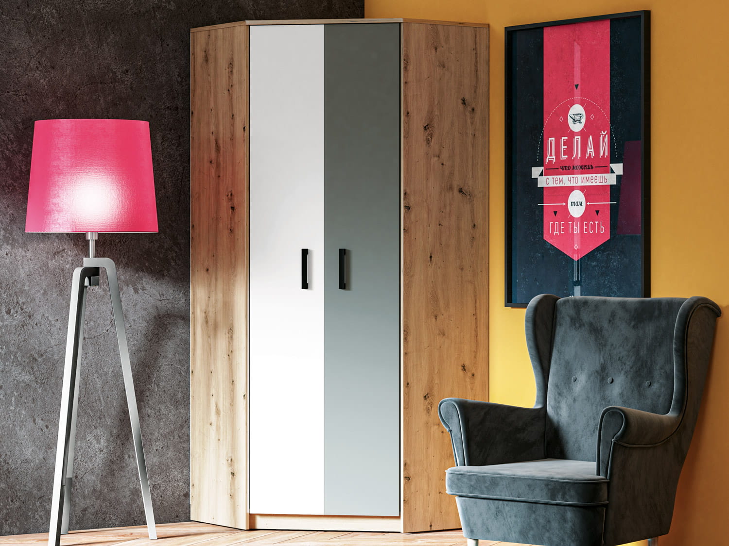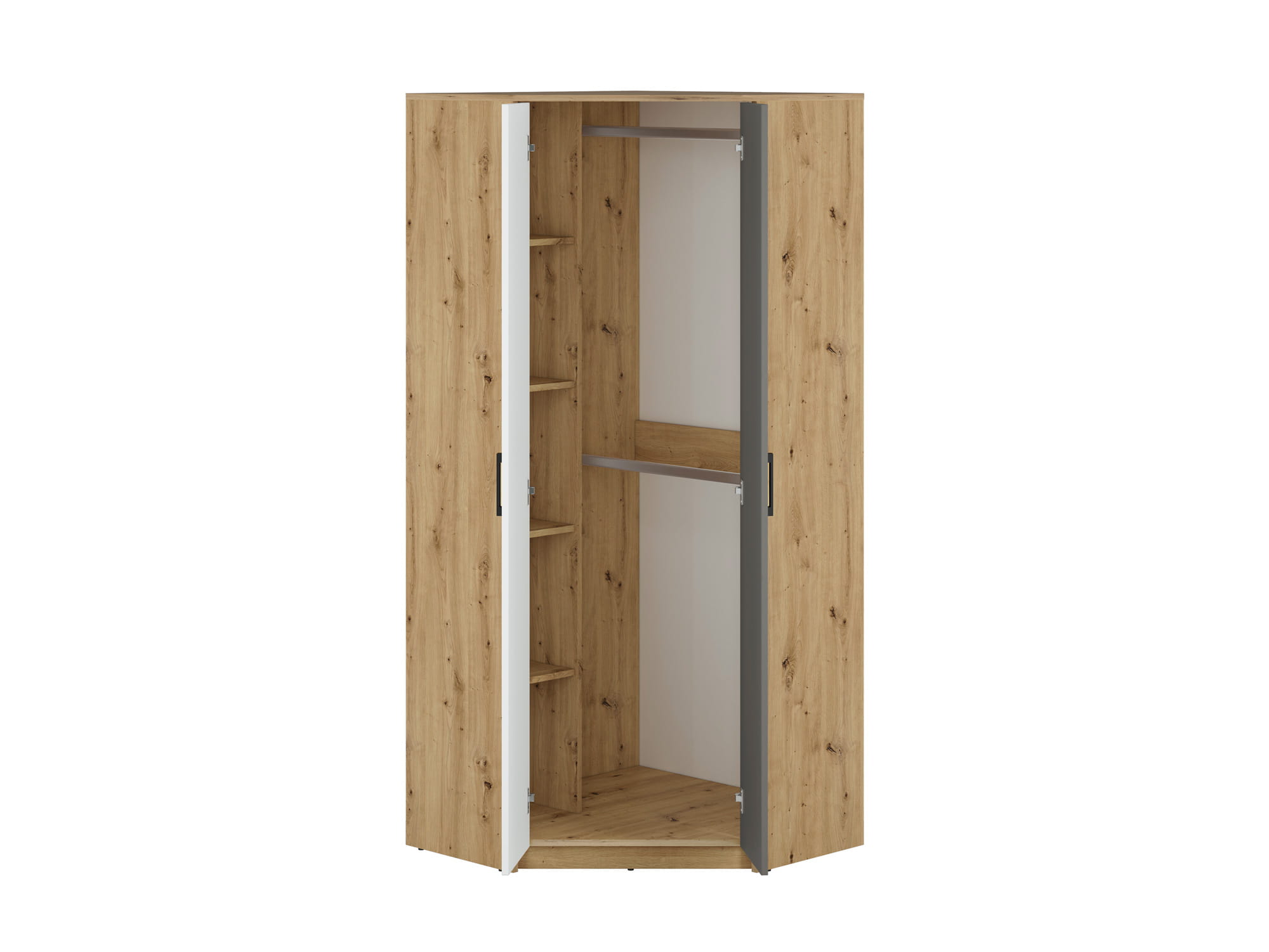Szafa narożna FINI 13 jest bardzo pojemna i ergonomiczna. Doskonale wpisze się w aranżację pomieszczenia, łącząc ją z jednej strony z szafą dwu- lub trzydrzwiową, a z drugiej z regałem na książki.