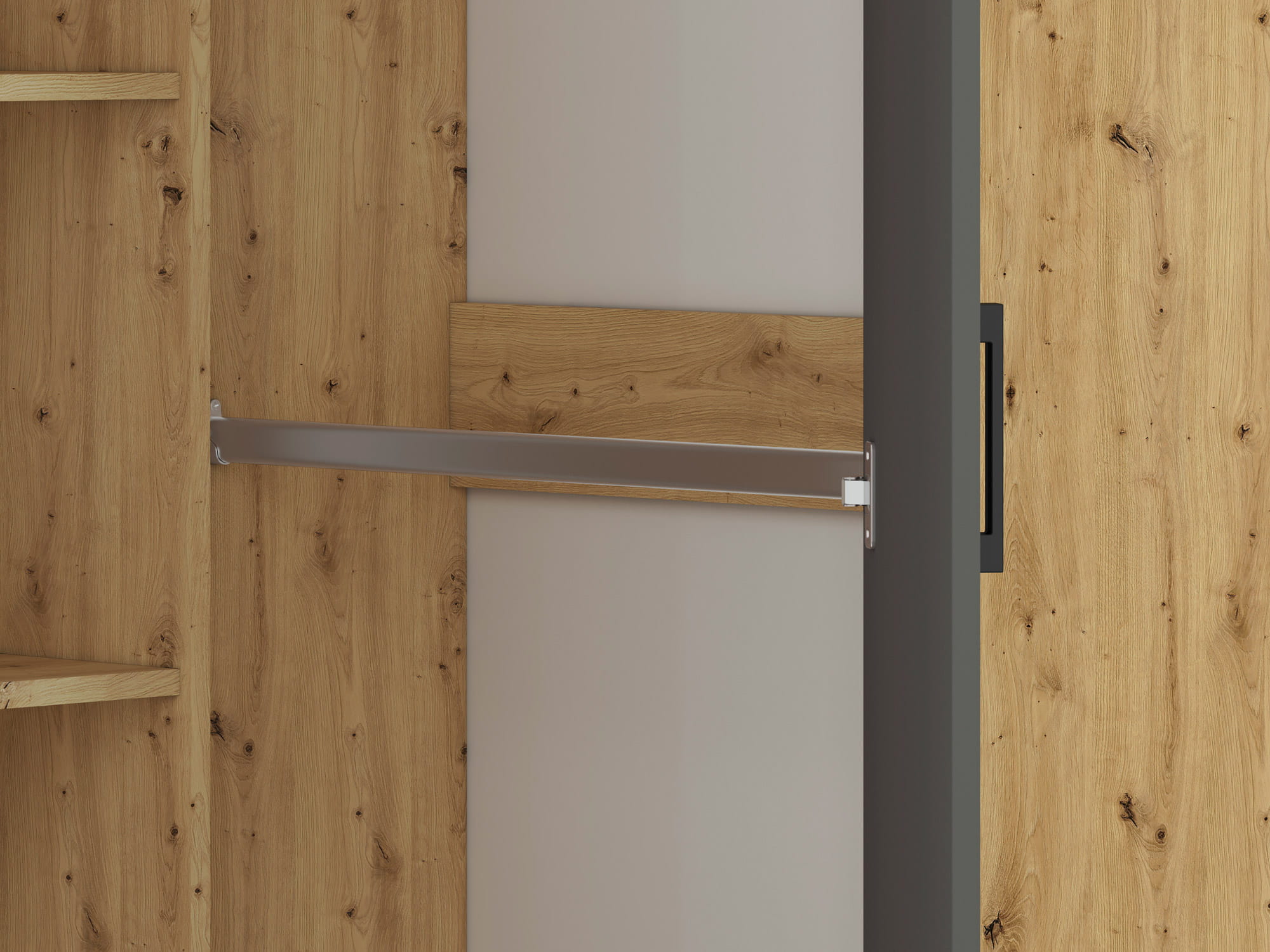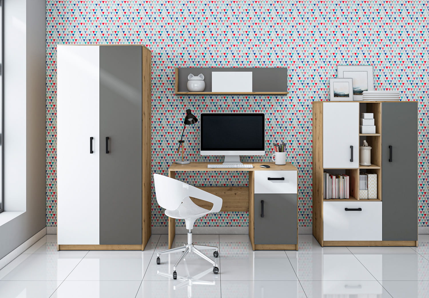 Kolekcja FINI to oryginalne i proste w formie bryły w modnych dekorach. Nowoczesna i zdecydowana kombinacja kolorów - białego alpejskiego i antracytowego z klasycznym dekorem Dąb Artisan odzwierciedla dynamiczny temperament nastolatków. Geometria frontów i korpusów tworzy efekt porządku, spójności oraz młodzieżowej elegancji. Kontrastujące czarne uchwyty podkreślają nieprzeciętność mebli FINI.