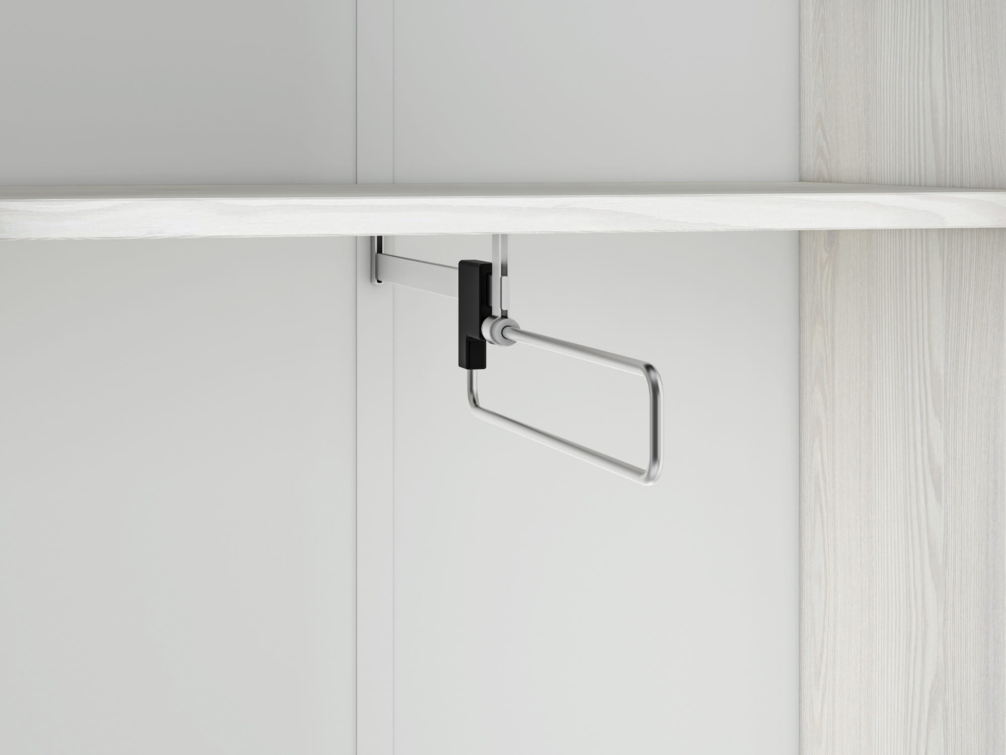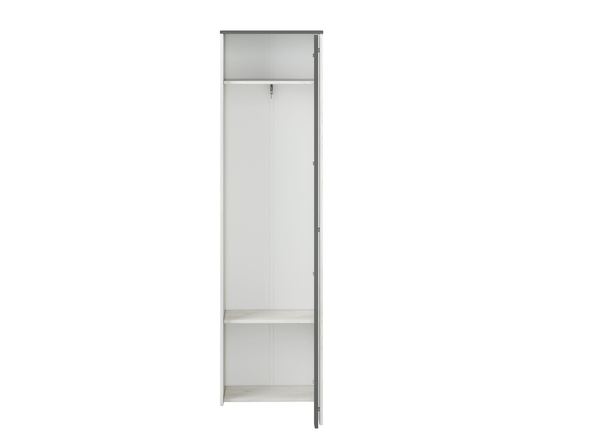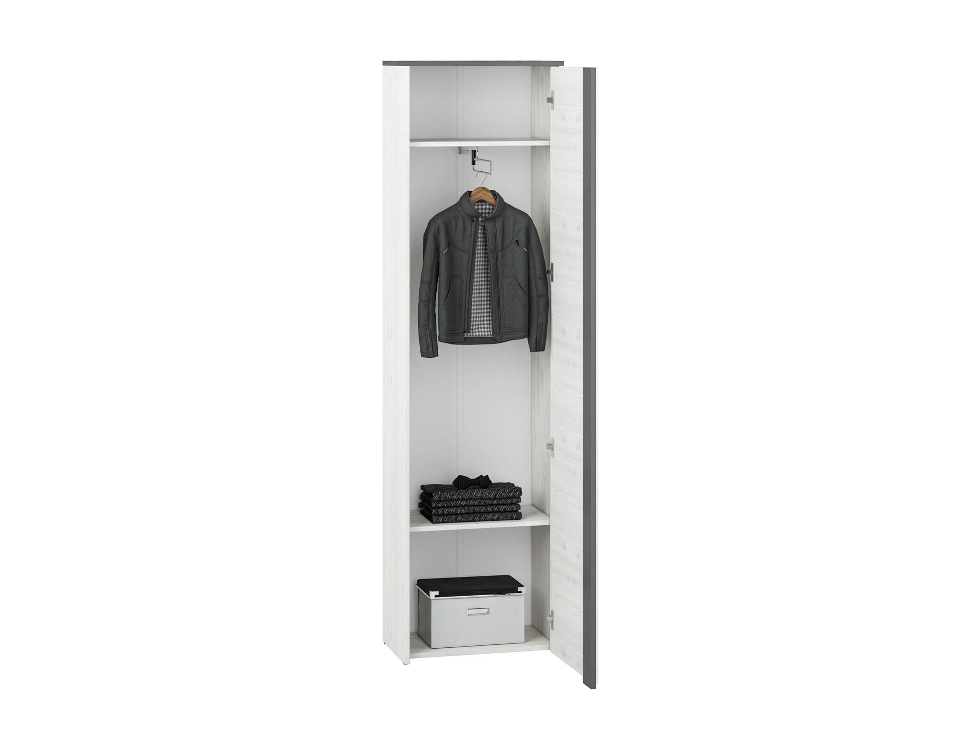 Szafa HYGA 06 posiada proste i nowoczesne fronty oraz korpus w kolorze Sosny Śnieżnej, które świetnie kontrastują z elementami w kolorze antracytu. Przechowywanie ubrań, butów oraz akcesoriów dzięki pojemności szafy nie będzie już wyzwaniem.