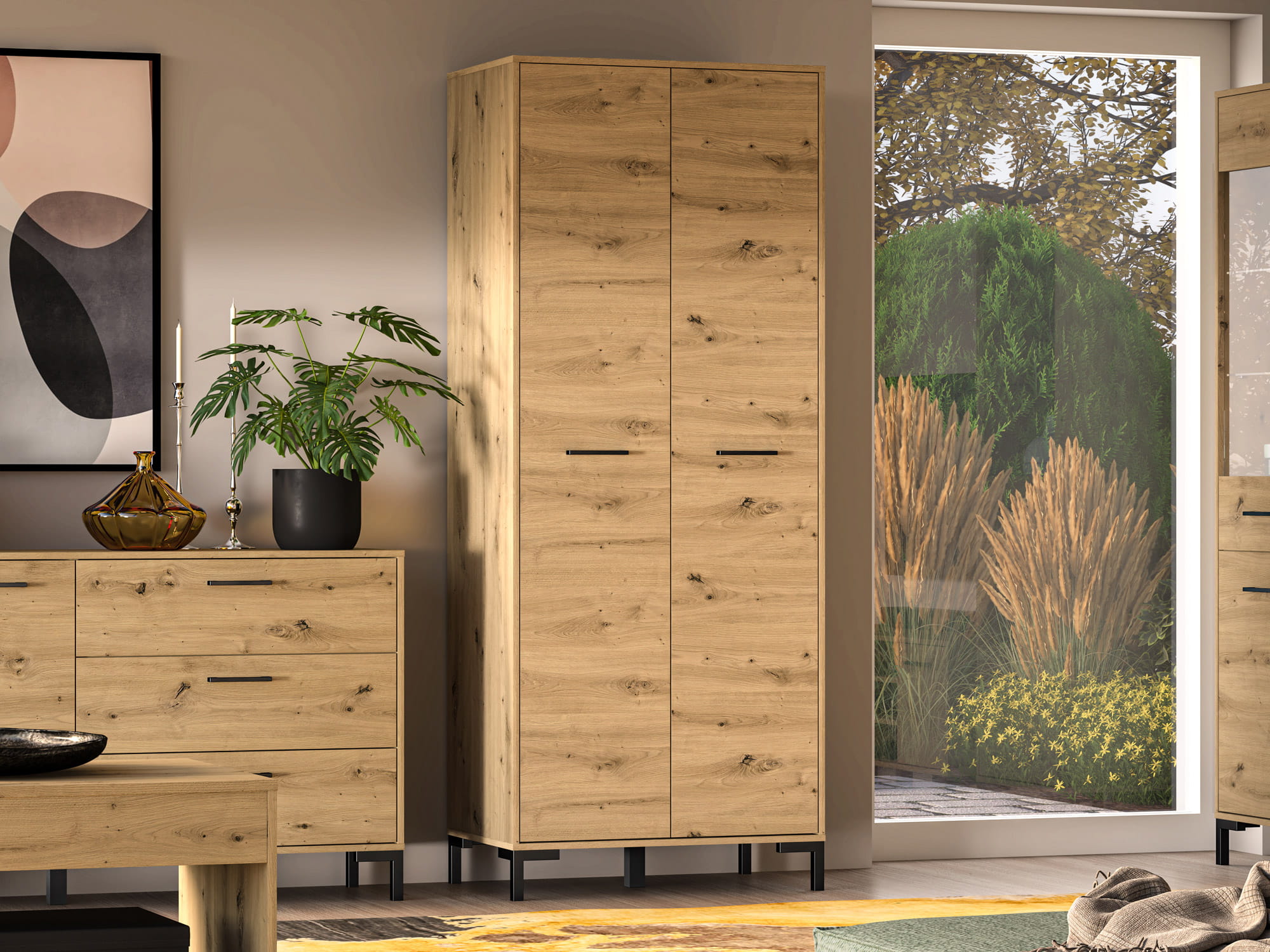 NEVIO to nowoczesna i elegancka kolekcja mebli do przedpokoju. Dekor Dąb Artisan wraz z czarnymi uchwytami oraz nóżkami jest idealnym rozwiązaniem do współczesnego wnętrza. Przemyślana konstrukcja brył zapewni miejsce do przechowywania butów oraz ubrań. Miękkie, tapicerowane siedziska oraz wieszak gwarantują komfort użytkowania. Dzięki różnorodności mebli NEVIO z łatwością zaaranżujesz zarówno małe, jak i duże wnętrze.