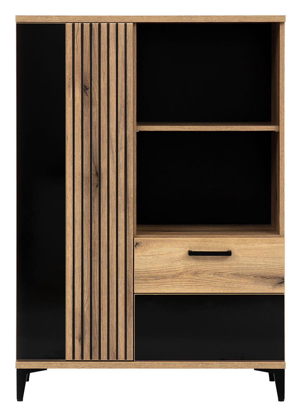 Czarne fronty w połysku w zestawieniu z dekorem drewna wzbogaconym efektem lameli nadają wnętrzu elegancji, natomiast wysokie czarne nóżki w połączeniu z czarnymi uchwytami powodują, że szafka jest dekoracją samą w sobie. Szafka idealnie sprawdzi się w konfiguracji z innymi bryłami z serii ARIS lub jako pojedynczy mebel, który można dopasować do własnej aranżacji pomieszczenia.