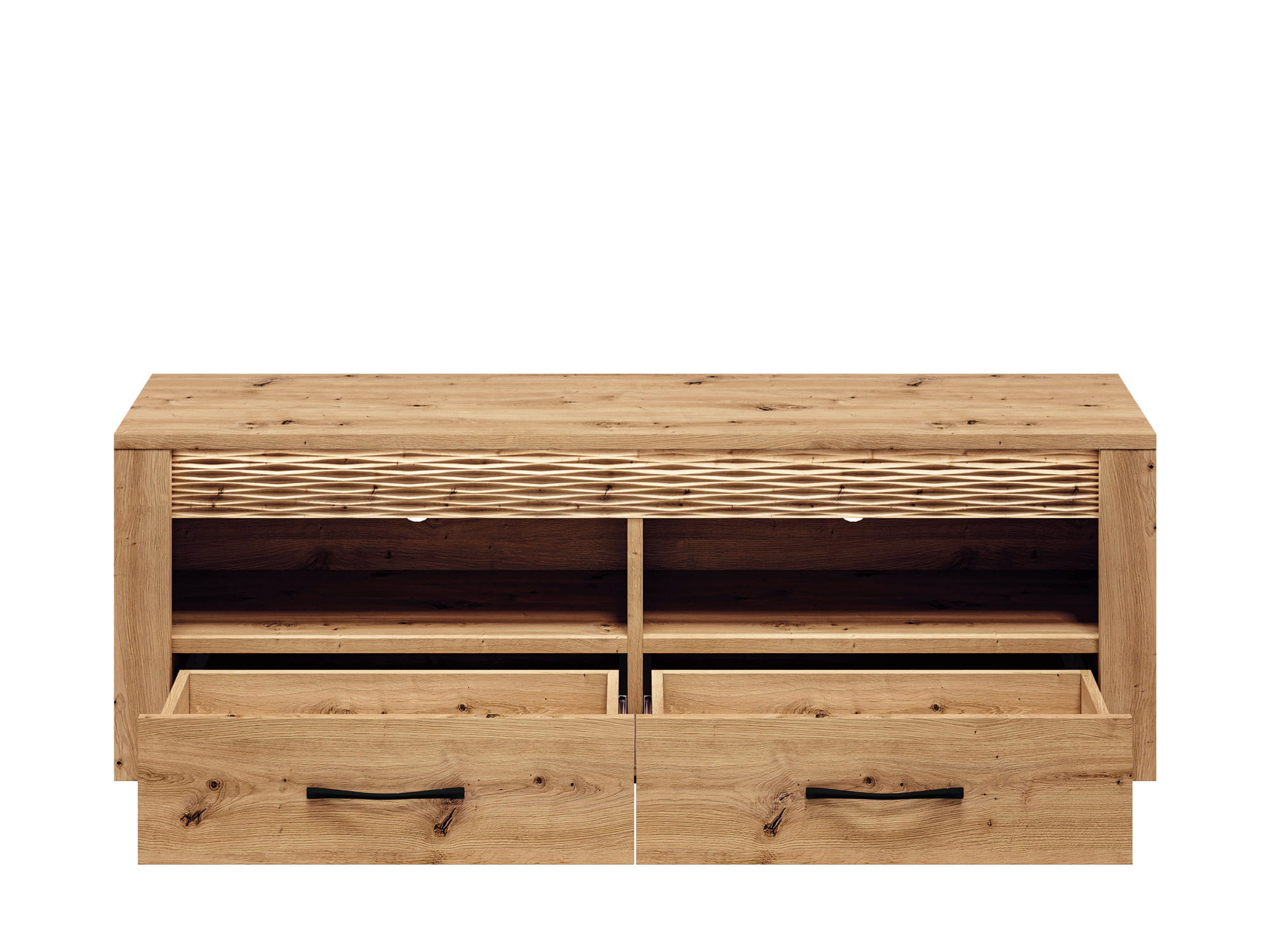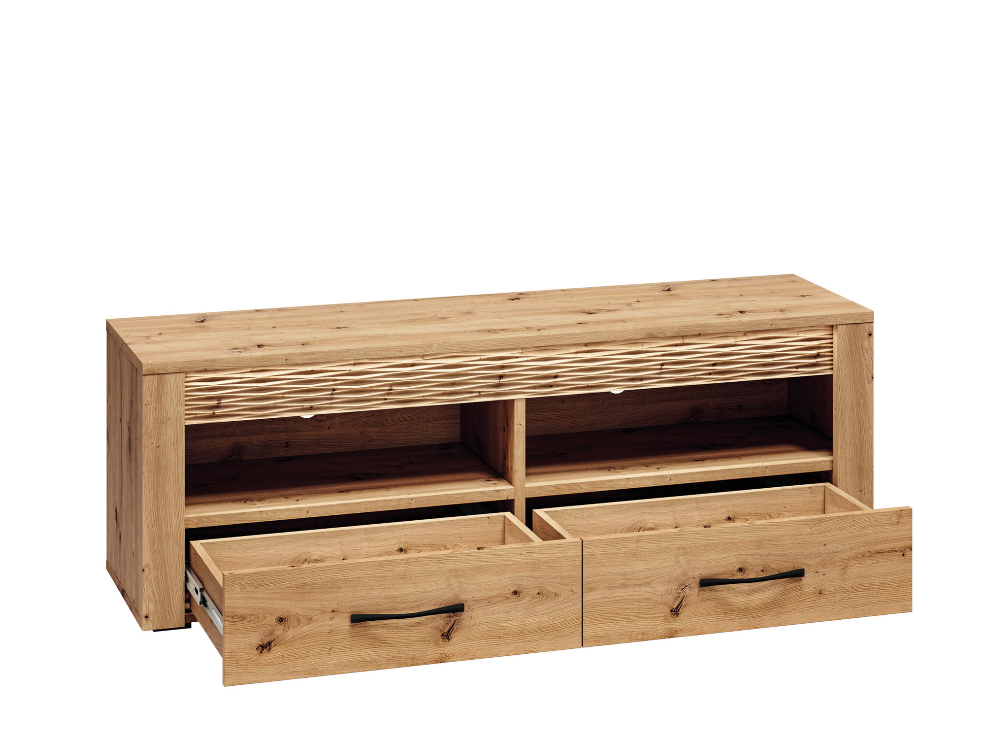 Szafka dzięki zamykanym szufladom oraz otwartym wnękom stanowi idealne miejsce do przechowywania akcesoriów do telewizora bądź konsoli.