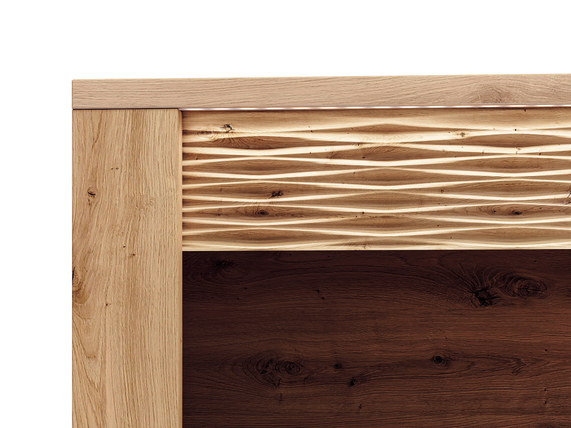 Czarne, metalowe uchwyty świetnie kontrastują z ciepłym dekorem dębu, a podświetlana, dekoracyjna ryfla doda Twojemu wnętrzu blasku i niepowtarzalnego klimatu.