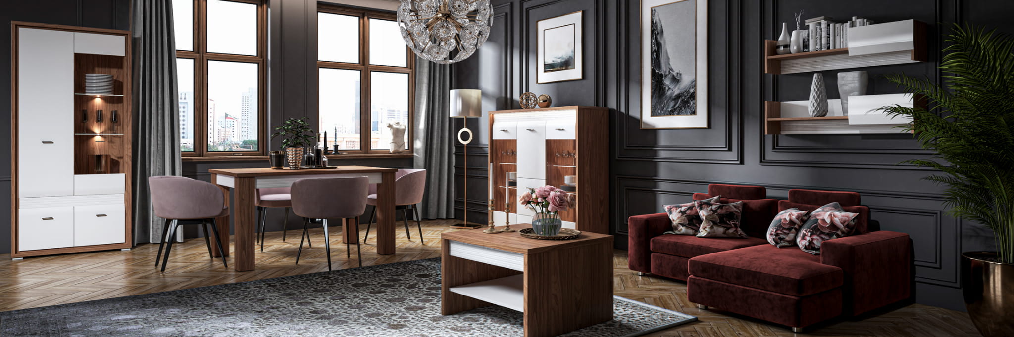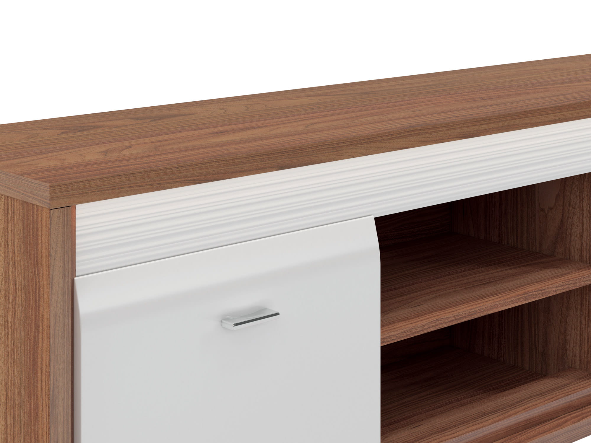 Kolekcja DALLAS to luksusowy design w nowoczesnym wydaniu. Starannie dobrane dekory, naturalny orzech i biały połysk dodają wnętrzu elegancji i świeżości. System DALLAS charakteryzują zaoblone ku górze fronty MDF, które swoim kształtem podkreślają unikalność bryły. Kolejnym atrakcyjnym detalem jest ryflowana listwa w dwóch kolorach do wyboru (biały lub orzechowy), która nadaje meblom charakteru. Całości dopełniają delikatne, metalizowane uchwyty. Wyróżnij się i przekonaj na czym polega magia dyskretnego luksusu.