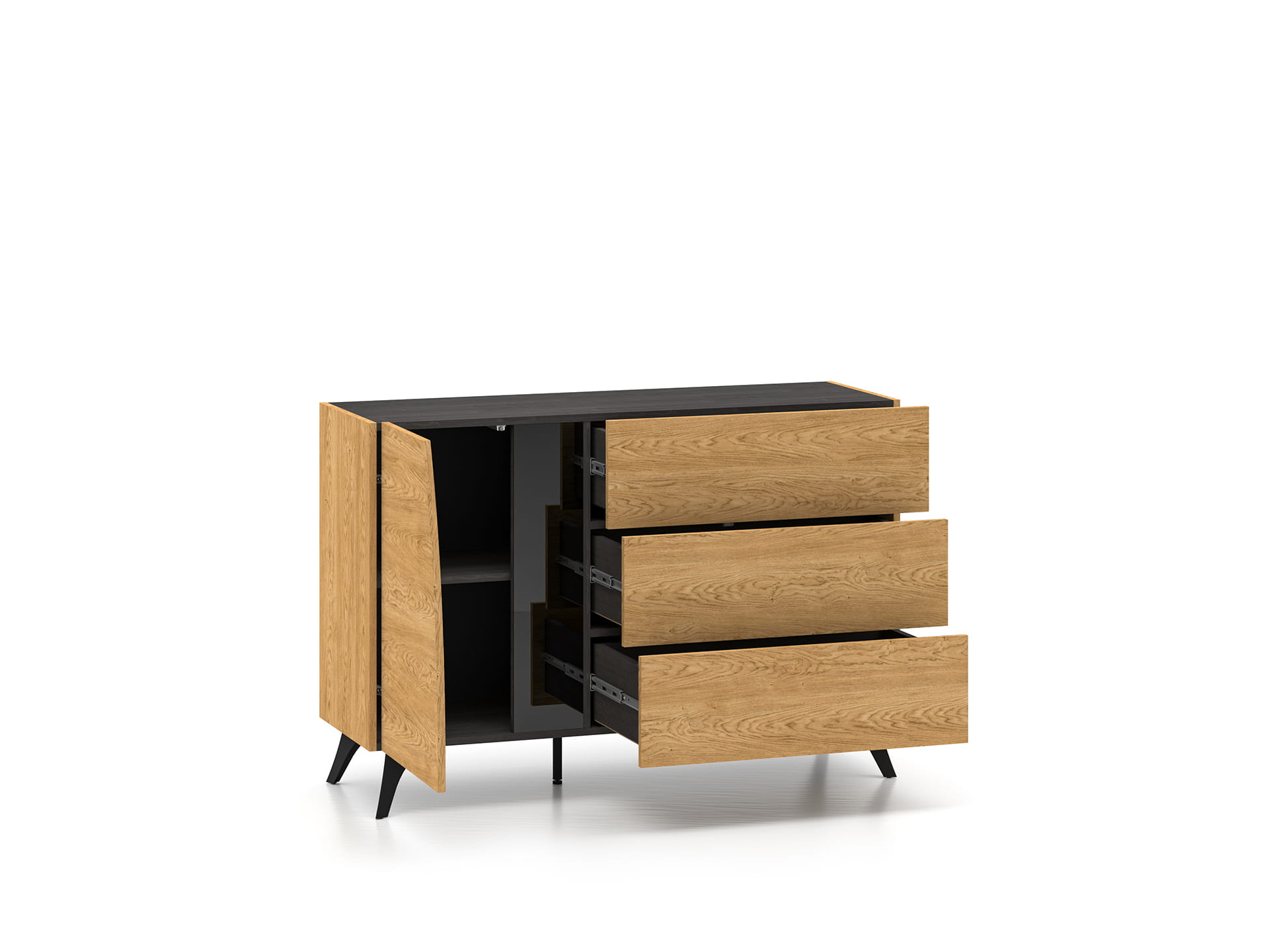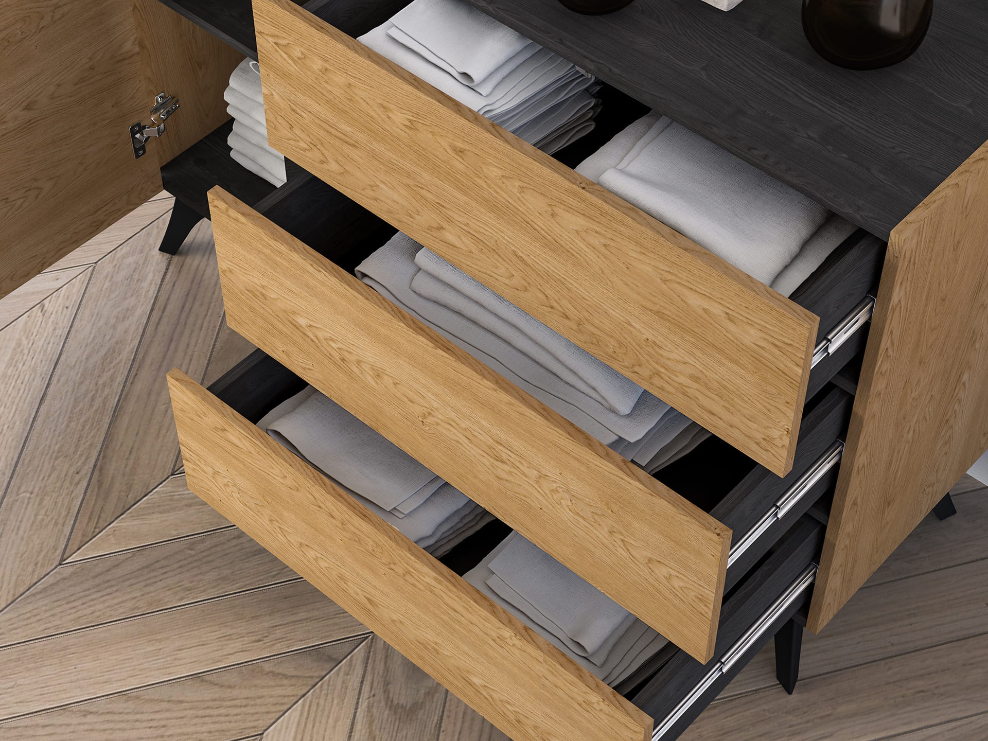 Prawą stronę mebla tworzą trzy głębokie szuflady, które zapewnią odpowiednią ilość miejsca na dokumenty, obrusy lub inne domowe tekstylia.