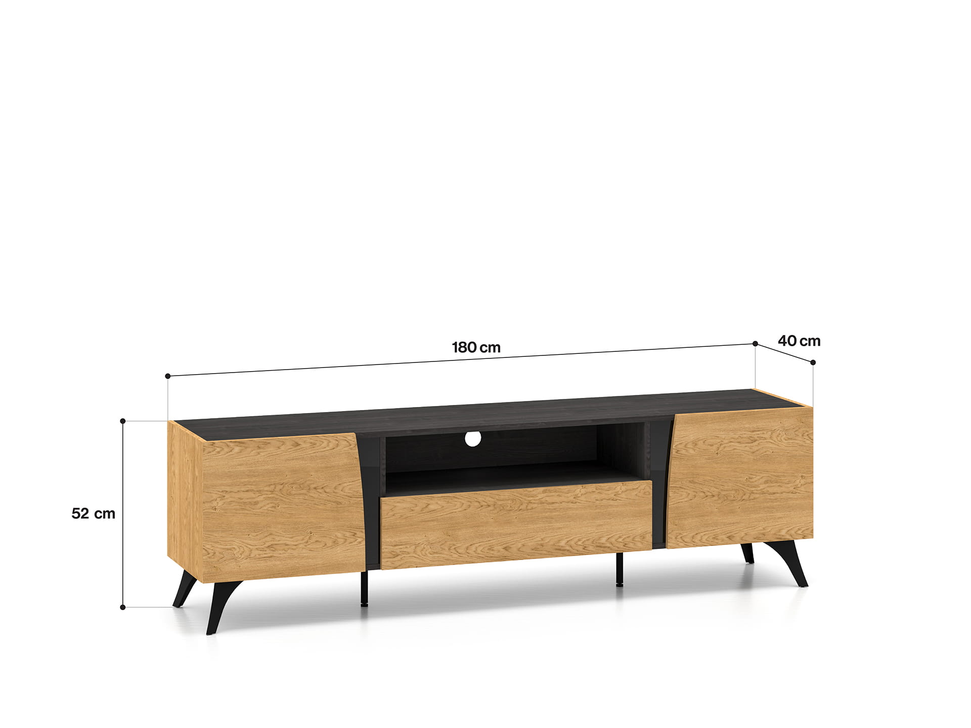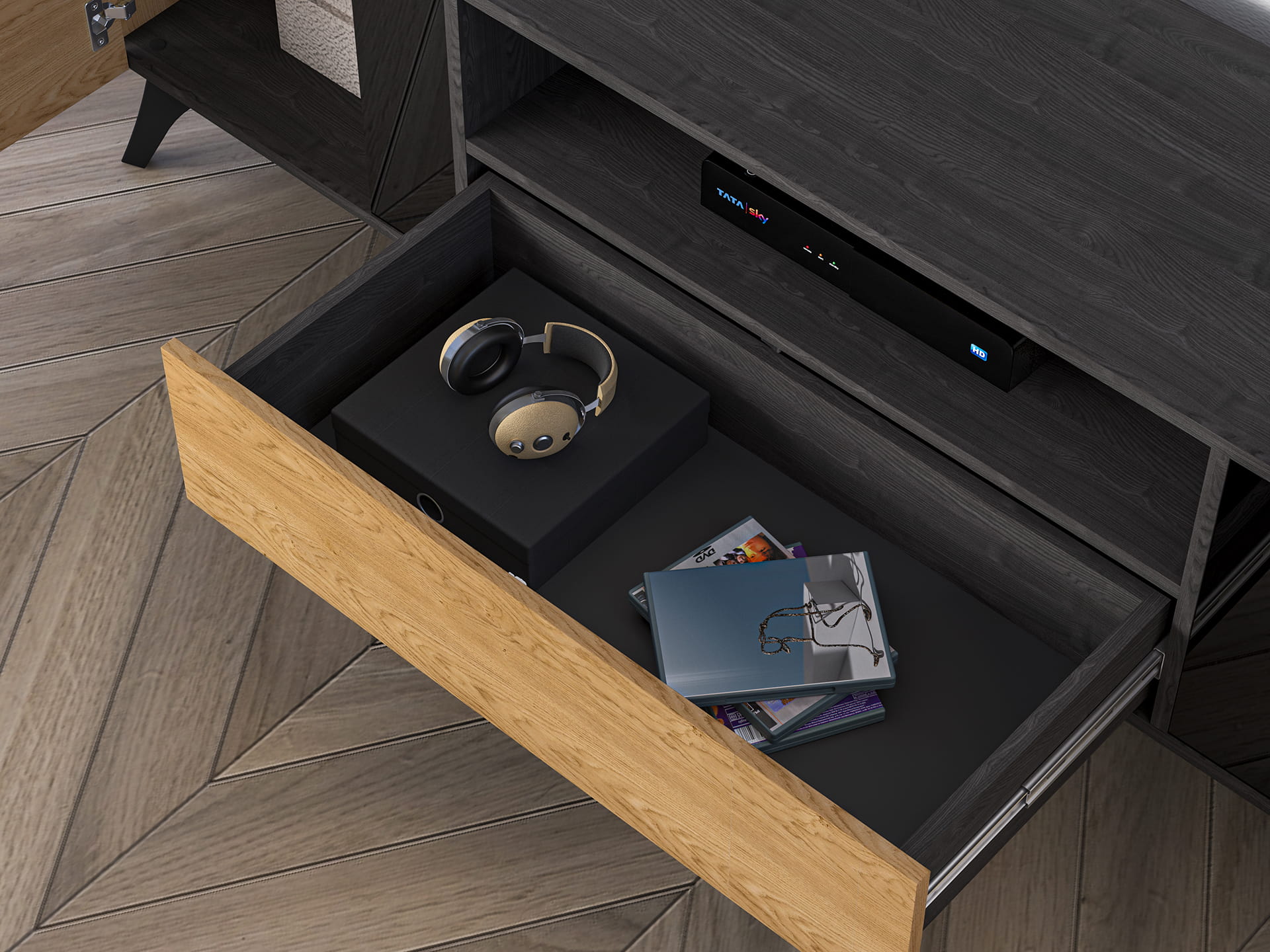 Dwie zamknięte wnęki tworzą bardzo pojemną przestrzeń do przechowywania, a otwarte półki oraz szeroki blat w prosty sposób pomogą uporządkować Twoje sprzęty multimedialne.