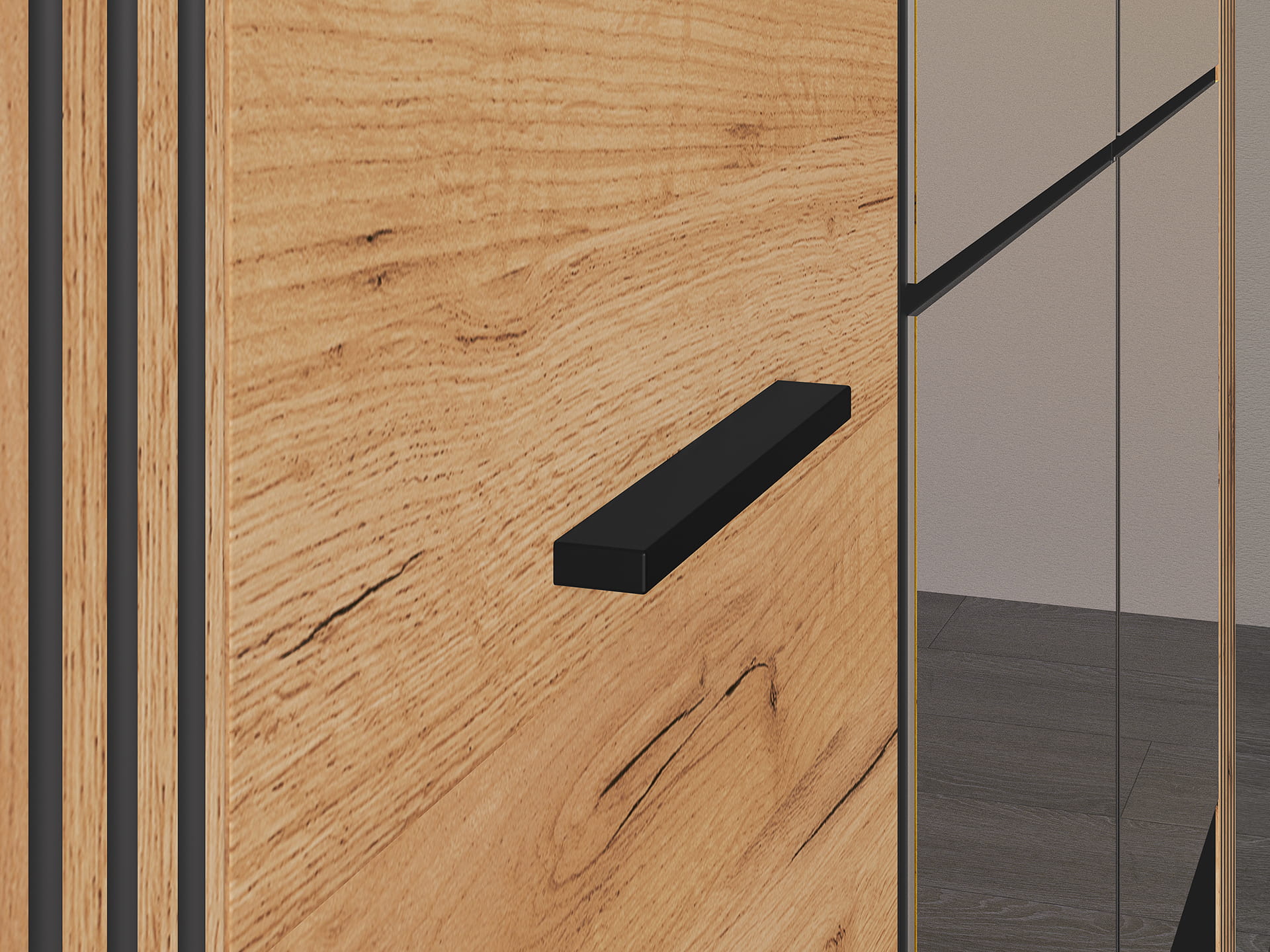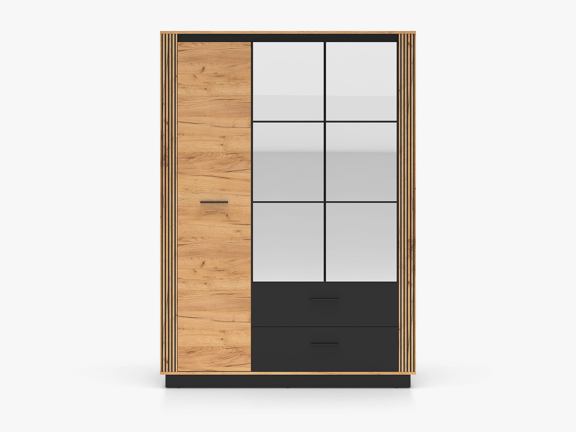 Styl: Front i korpus w kolorze dąb craft złoty i czarny uchwyt : czarny