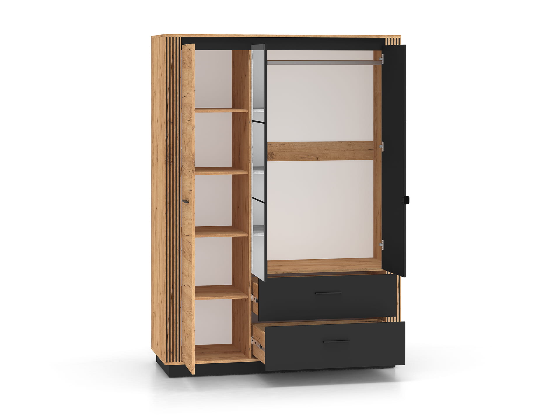 Konstrukcja: trzydrzwiowa szafa z praktycznymi szufladami.