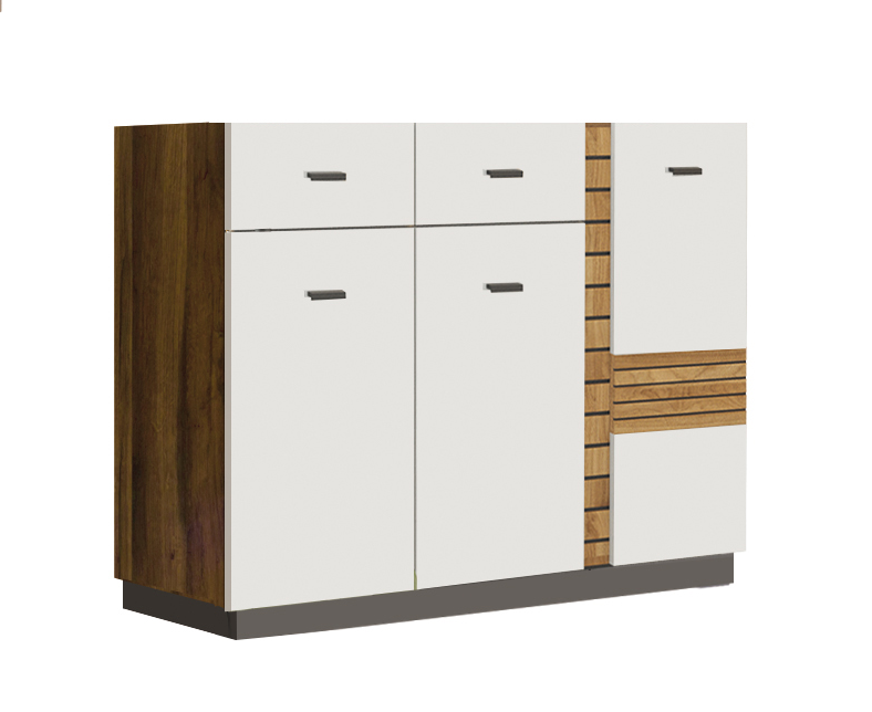 Meble wykonane są z wysokogatunkowej płyty z obrzeżem ABS w kolorze orzech.