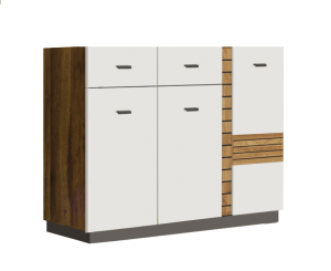 Komoda posiada 2 szuflady i troje drzwiczek .