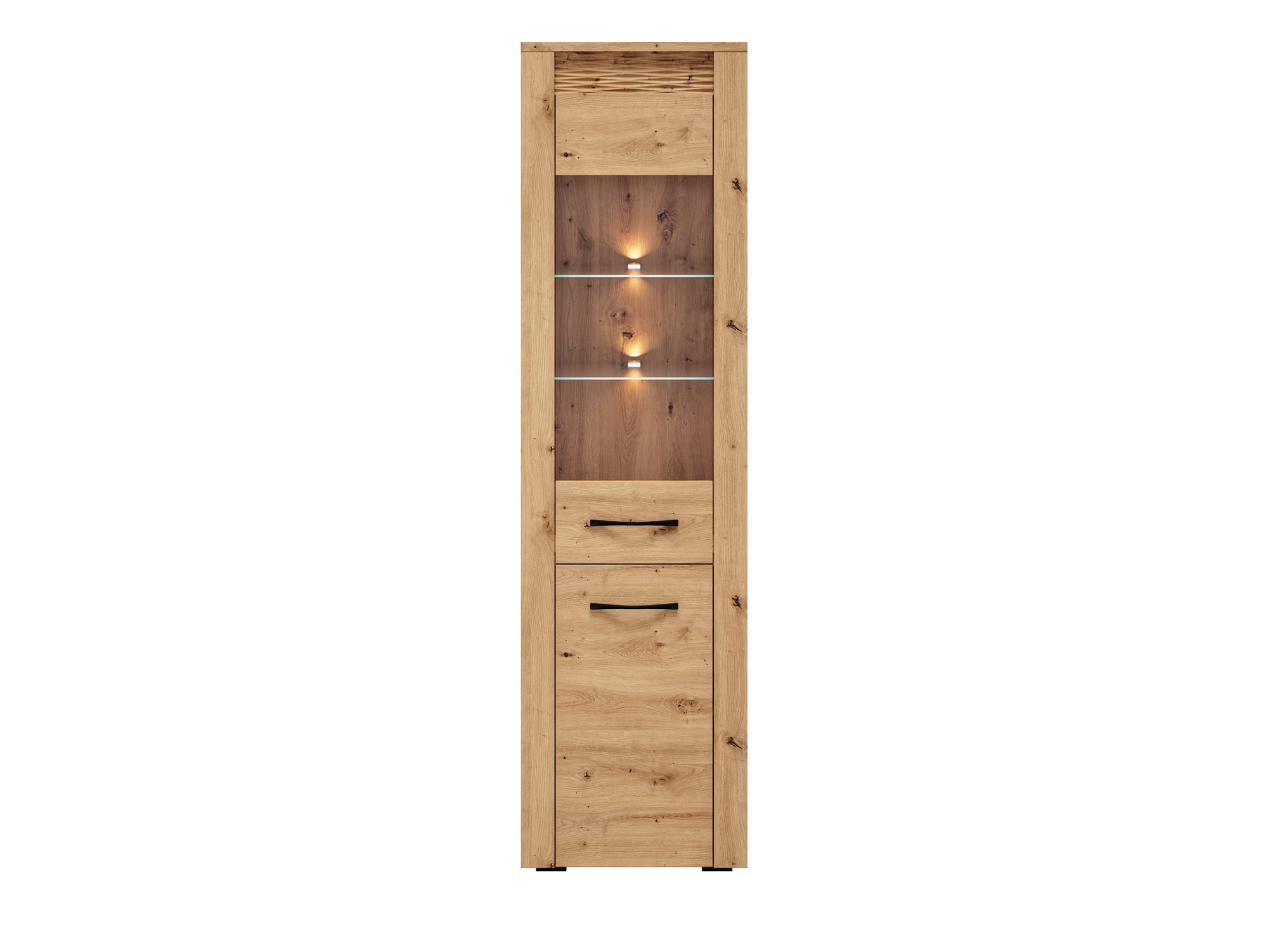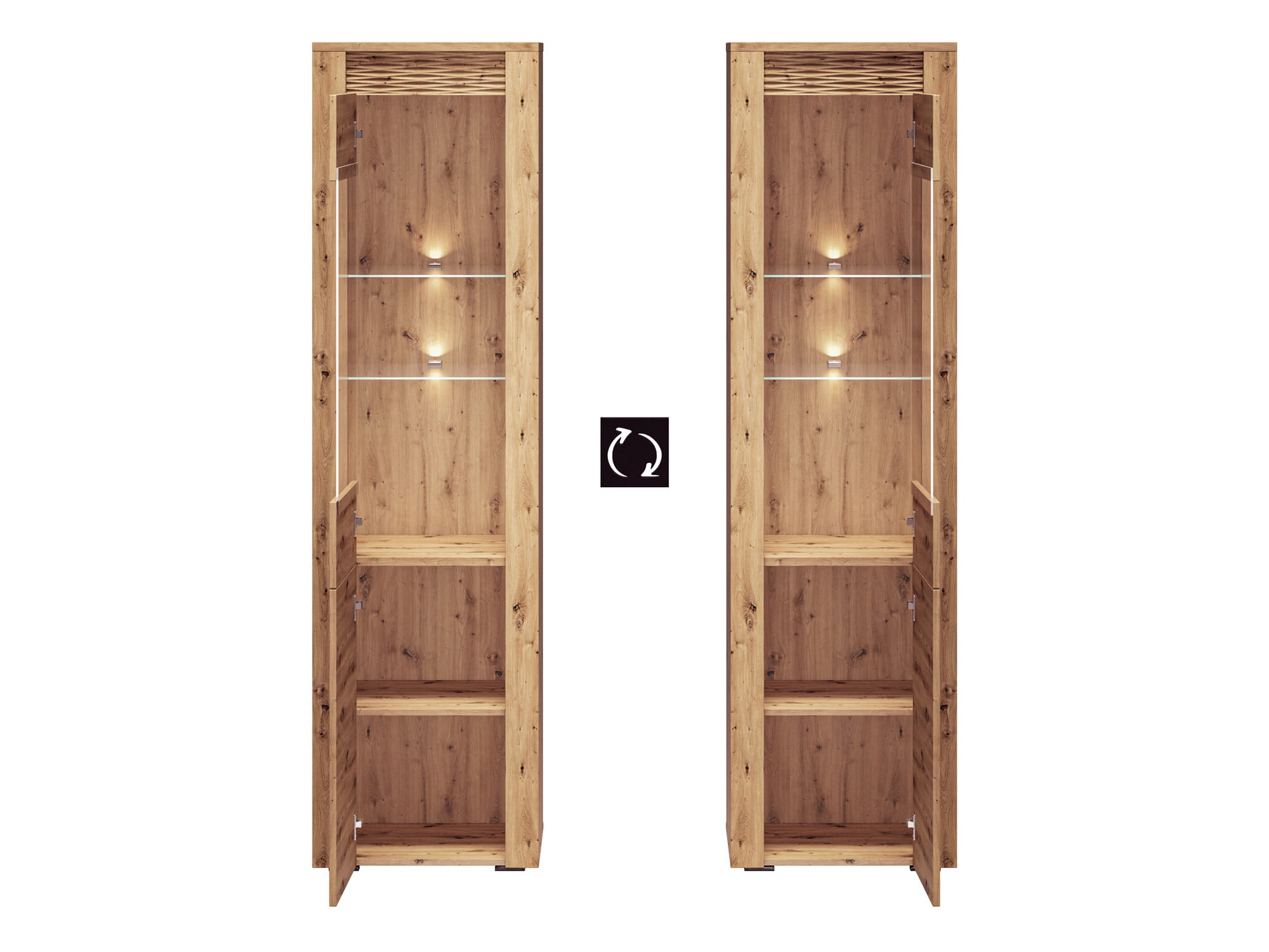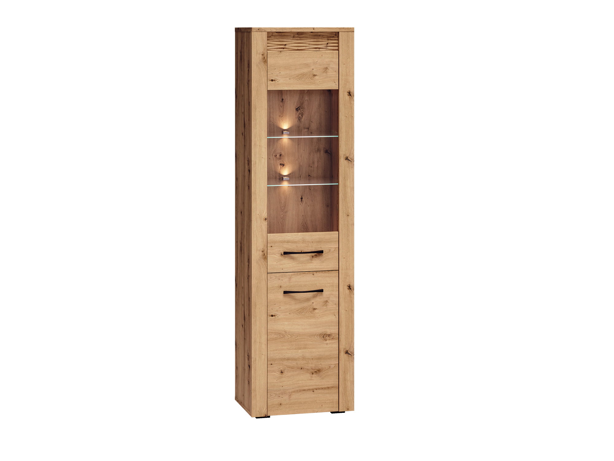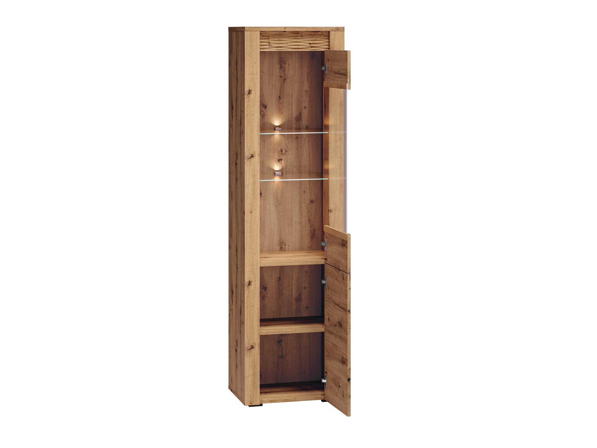 Witryna posiada drzwiczki zarówno przeszklone, jak i wykonane z wysokiej jakości płyty meblowej.