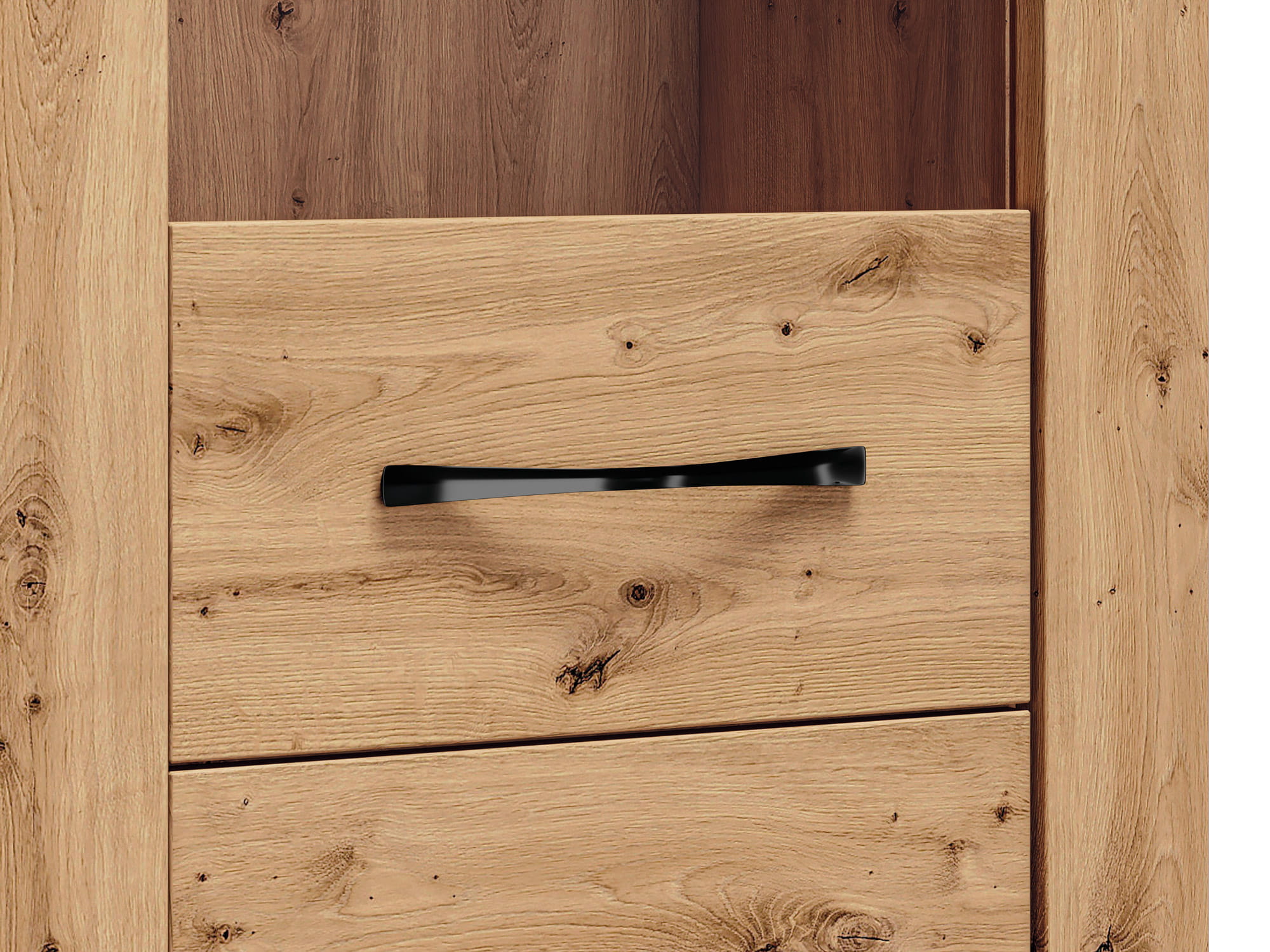 Czarne, metalowe uchwyty świetnie kontrastują z ciepłym dekorem dębu, a podświetlana, dekoracyjna ryfla doda Twojemu wnętrzu blasku i niepowtarzalnego klimatu.