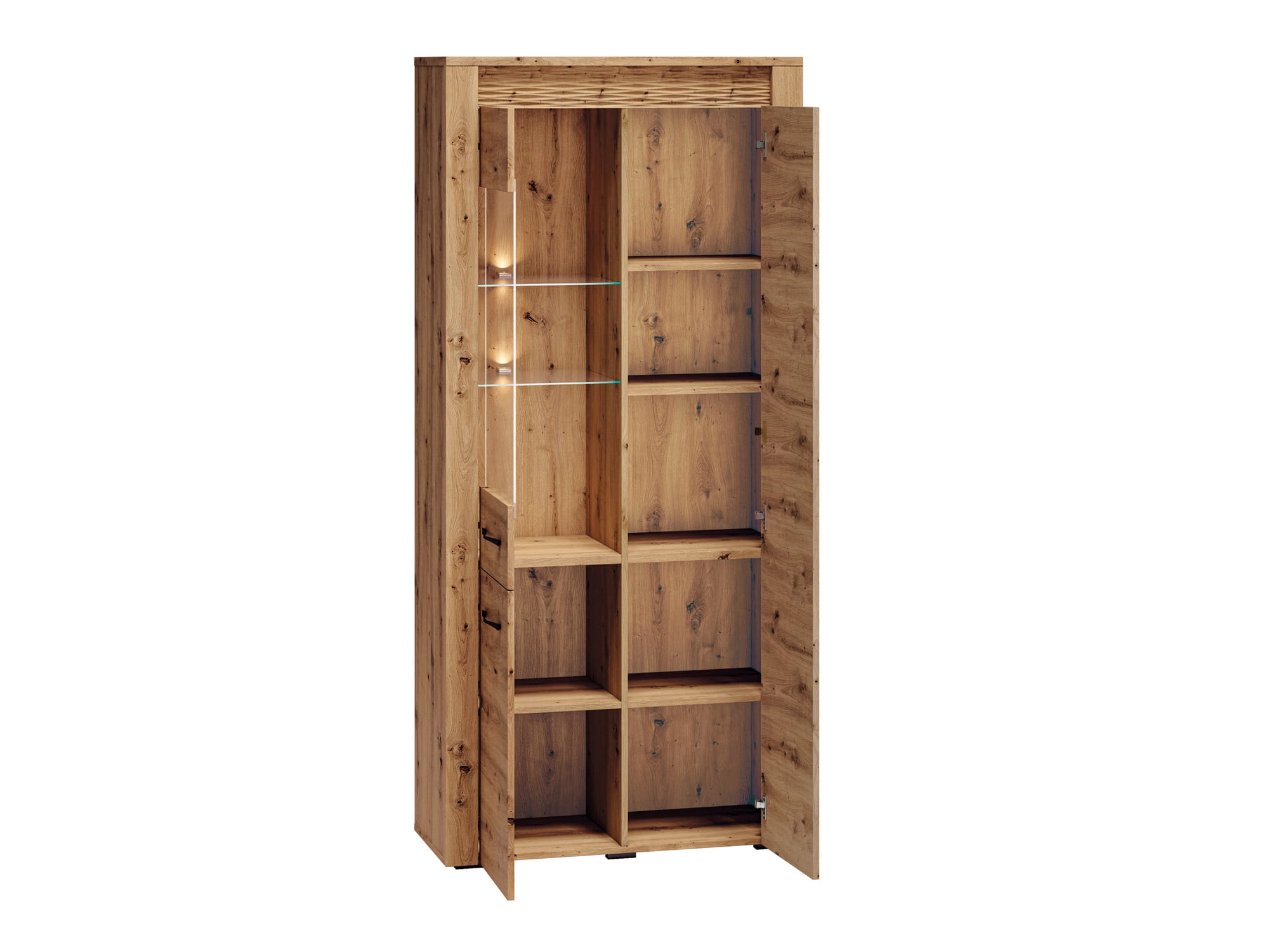 Witryna posiada drzwiczki zarówno przeszklone, jak i wykonane z wysokiej jakości płyty meblowej.
