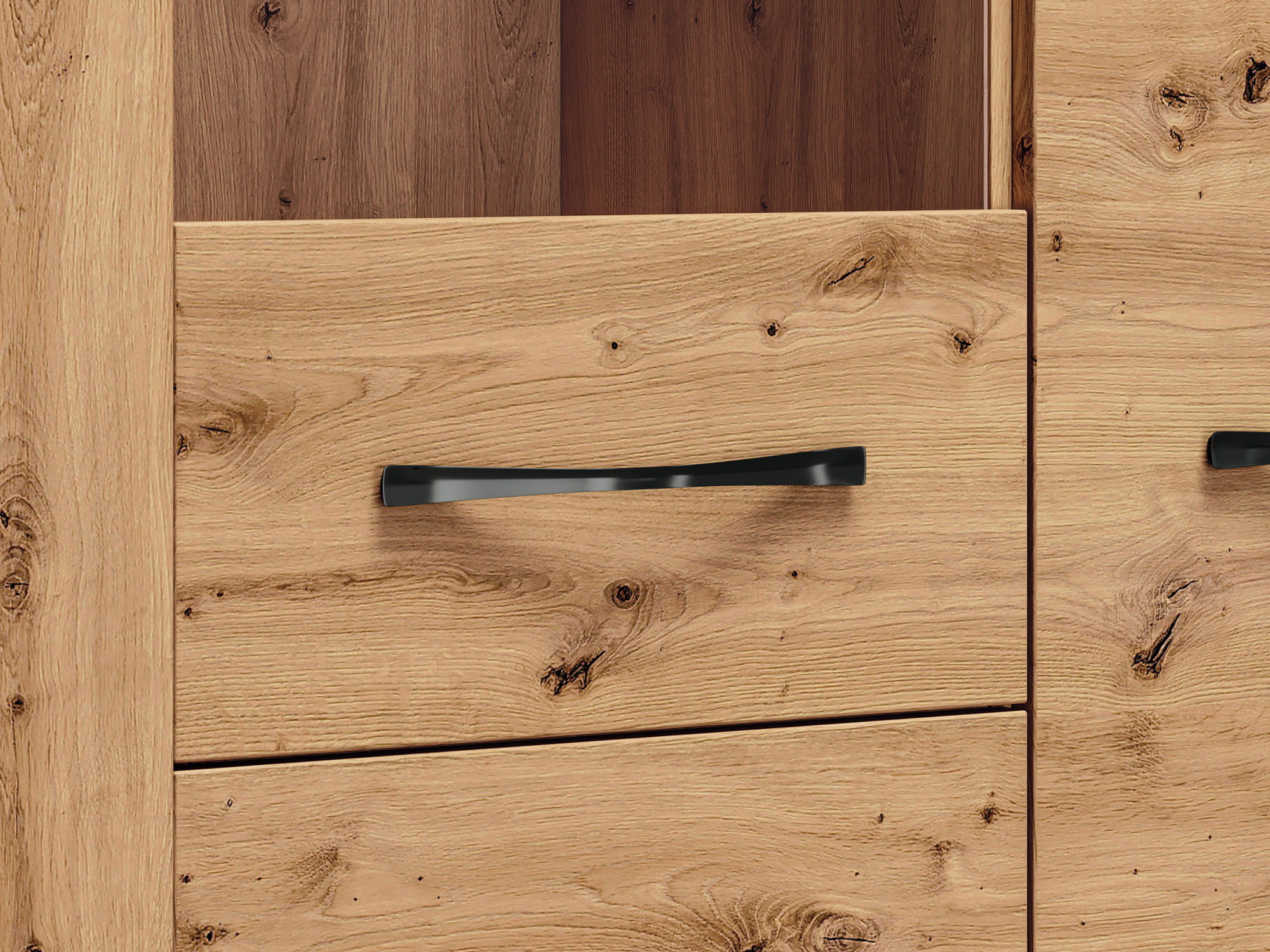 Czarne, metalowe uchwyty świetnie kontrastują z ciepłym dekorem dębu, a podświetlana, dekoracyjna ryfla doda Twojemu wnętrzu blasku i niepowtarzalnego klimatu.