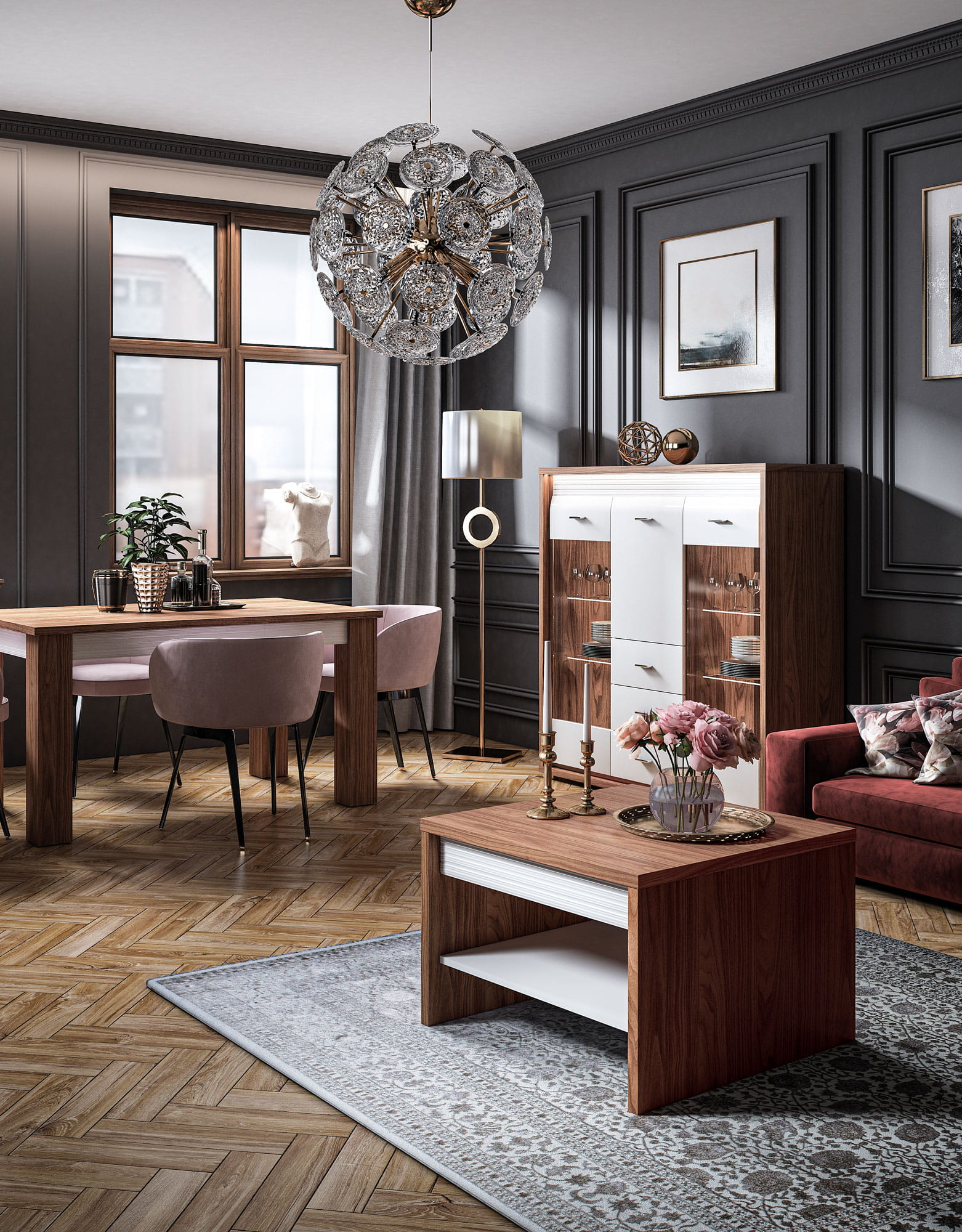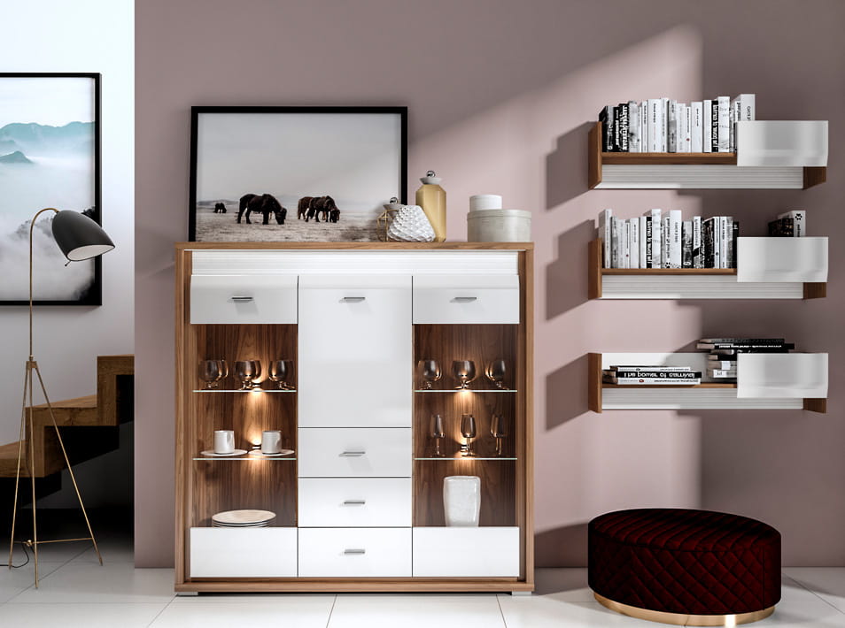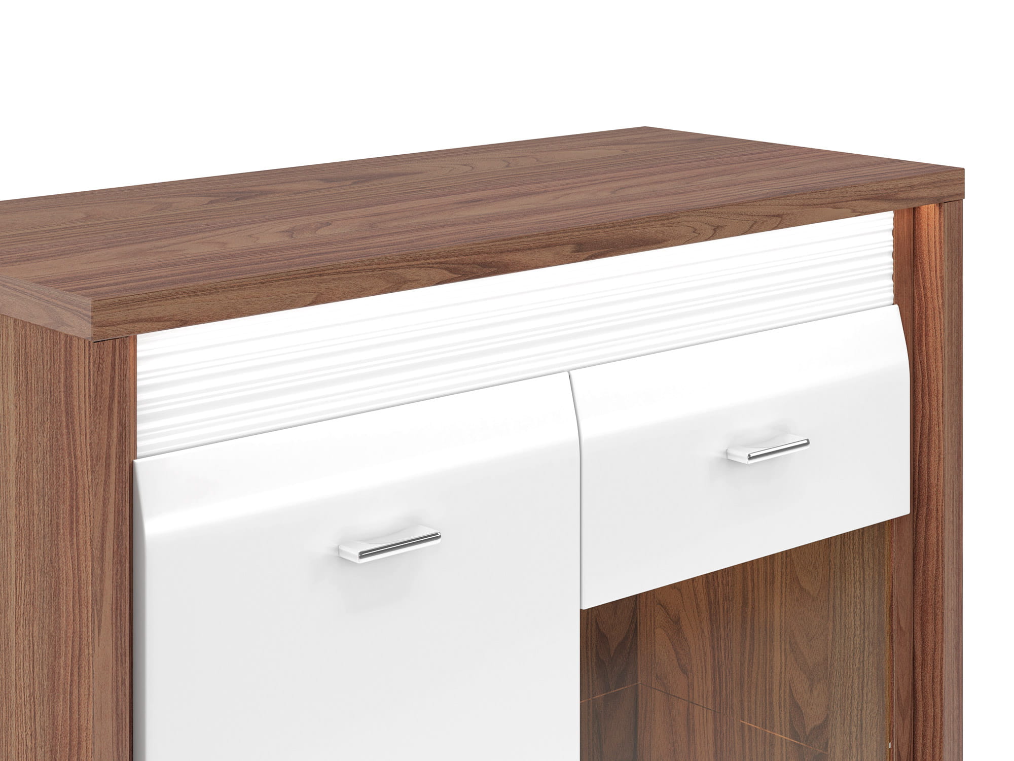 Kolekcja DALLAS to luksusowy design w nowoczesnym wydaniu. Starannie dobrane dekory, naturalny orzech i biały połysk dodają wnętrzu elegancji i świeżości. System DALLAS charakteryzują zaoblone ku górze fronty MDF, które swoim kształtem podkreślają unikalność bryły. Kolejnym atrakcyjnym detalem jest ryflowana listwa w dwóch kolorach do wyboru (biały lub orzechowy), która nadaje meblom charakteru. Całości dopełniają delikatne, metalizowane uchwyty. Wyróżnij się i przekonaj na czym polega magia dyskretnego luksusu.