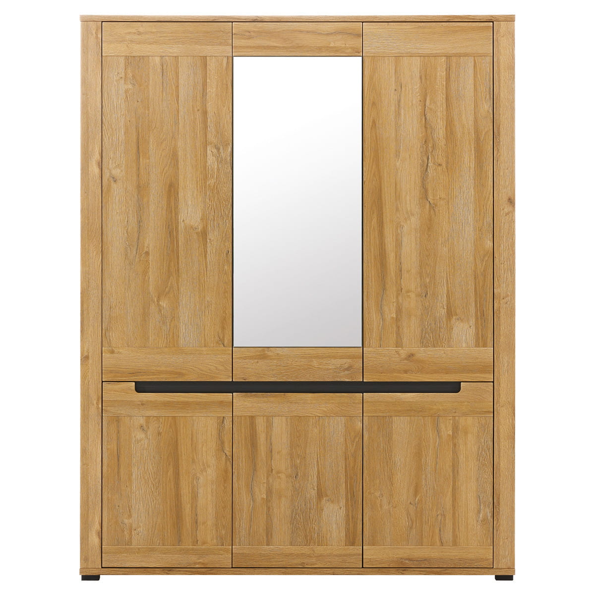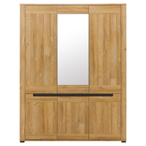 Szafa YORK Y08 to szeroka trzydrzwiowa szafa z pojemnym wnętrzem dedykowana do sypialni, garderoby lub przedpokoju. Wnętrze szafy podzielono na dwie części. Z jednej strony znajdziesz półki, na których poukładasz drobne części garderoby i dodatki, a z drugiej dużą przestrzeń z drążkiem, gdzie odwiesisz płaszcze oraz koszule. Lustro znajdujące się w środkowej części pozwoli optycznie powiększyć pomieszczenie. Zestawienie ciepłego odcienia drewna z grafitowymi elementami szafy przyciąga wzrok oraz tworzy niezwykle designerski mebel do każdego rodzaju wnętrz. Bezuchwytowe fronty dodają całości lekkości i podkreślają oryginalny charakter mebla. Szafa idealnie sprawdzi się w konfiguracji z innymi bryłami z serii YORK lub jako pojedynczy mebel, który można dopasować do własnej aranżacji pomieszczenia