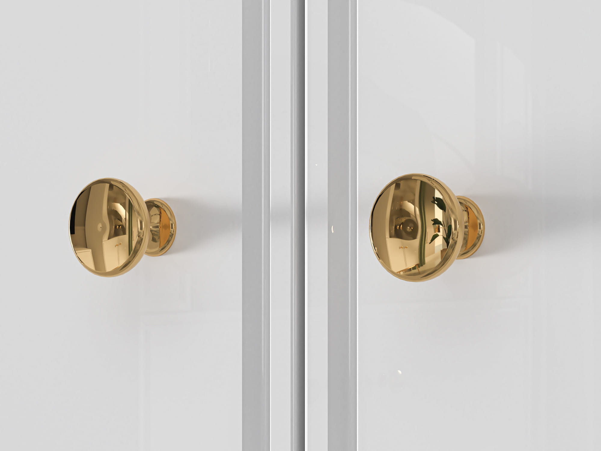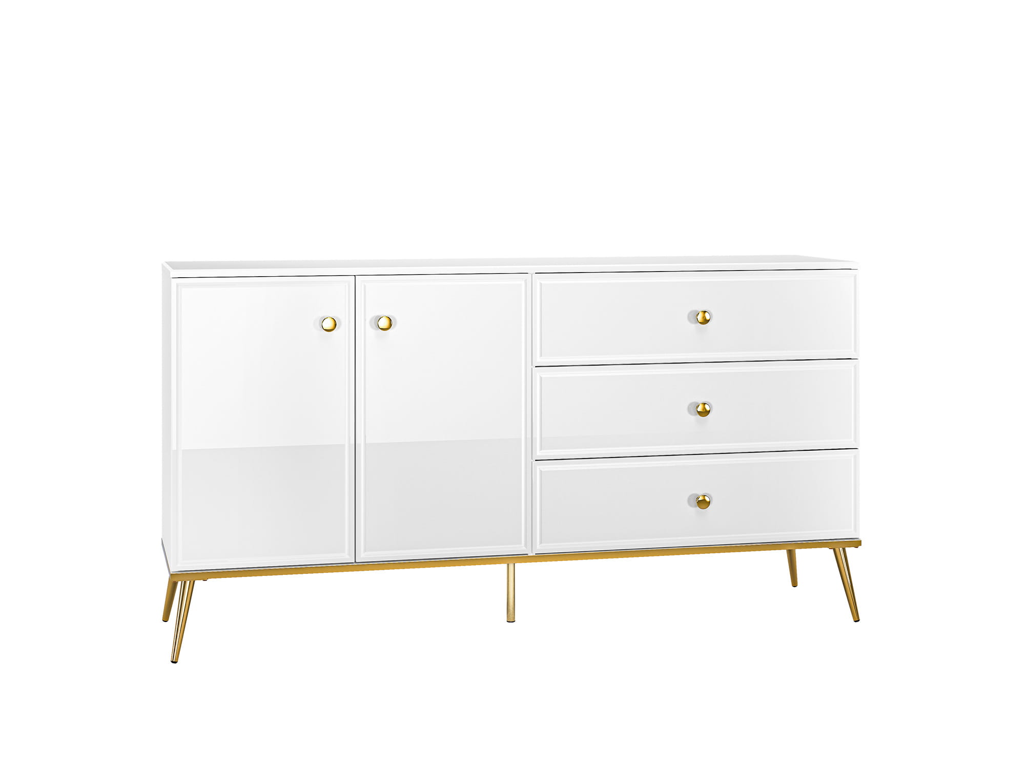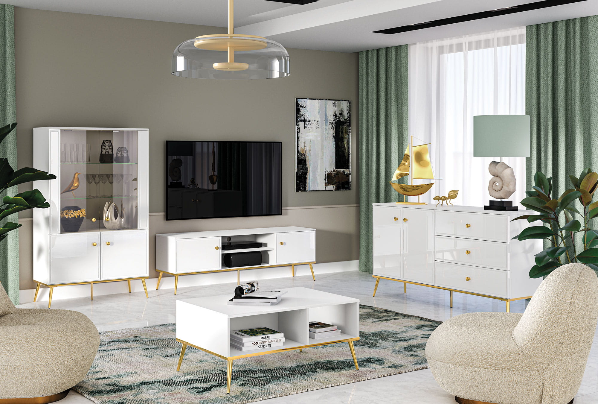 GOLDIN to kolekcja nowoczesnych mebli do salonu, sypialni czy pokoju młodzieżowego. Frezowane fronty oraz złote wykończenie wieńca dolnego stanową nietuzinkowe rozwiązanie do każdego wnętrza. Połyskująca biel dodaje prostym bryłom oryginalnego charakteru, a uchwyty w kolorze złotym podkreślają ich współczesny styl oraz nadają bryłom dużo elegancji. Modne i praktyczne nóżki sprawiają, że meble prezentują się lekko, a wnętrze sprawia wrażenie bardziej przestrzennego.