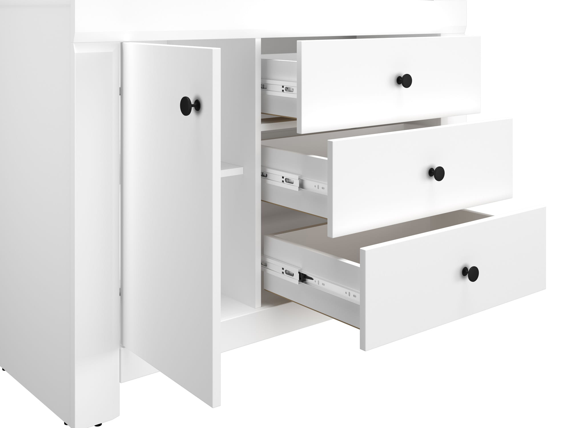 Kolekcja LAHTI to piękne, klasyczne, białe meble. Minimalistyczne, proste fronty MDF połączone z okalającymi bryłę oryginalnie frezowanymi listwami MDF to cechy idealnego mebla do współczesnego wnętrza. Lekko odbijające światło, czarne, metalowe uchwyty kontrastują z płytą meblową nadając całości wyjątkowego charakteru. Dzięki różnorodności brył z łatwością urządzisz pokój dzienny bądź pokój młodzieżowy.